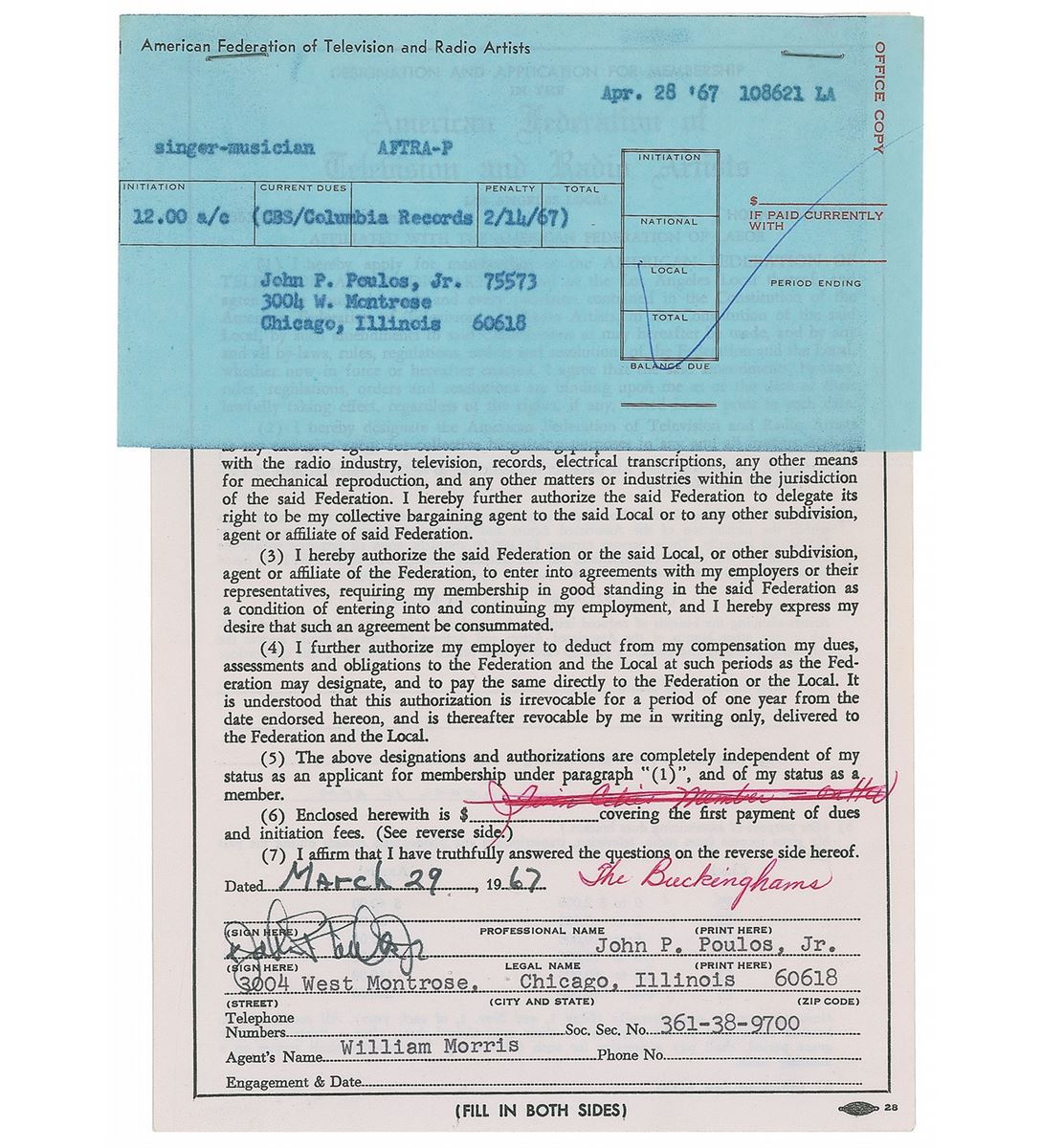 Two items: a standard AFTRA membership application signed “John P. Poulos, Jr.,” one page both sides, 6 x 8.75, April 28, 1967; and vintage circa 1967 ballpoint signatures of Marty Grebb, John Poulos, Dennis Tufano, Carl Giammarese, and Nick Fortuna on an off-white 5.5 x 4.25 album page. In overall fine condition.