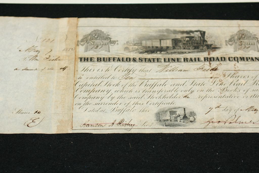 The Buffalo State Line Rail Road Co. Stock Certificate Dated 1852