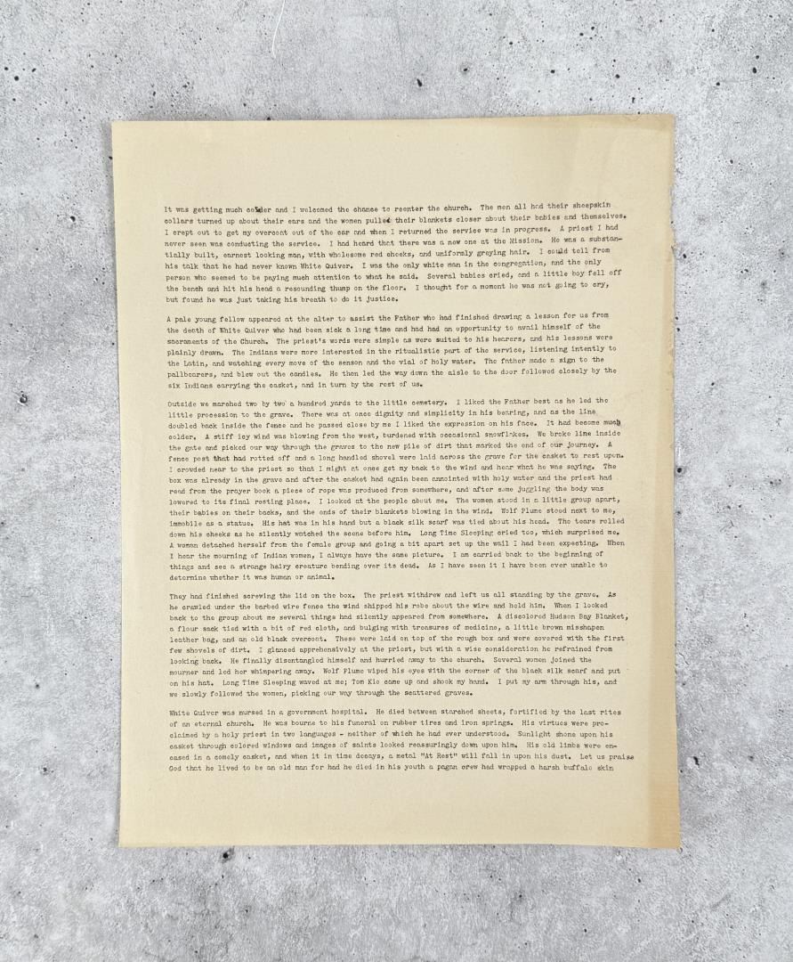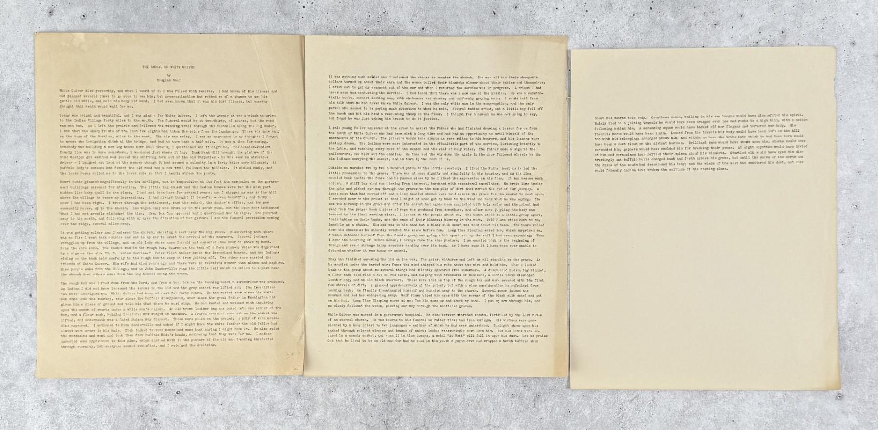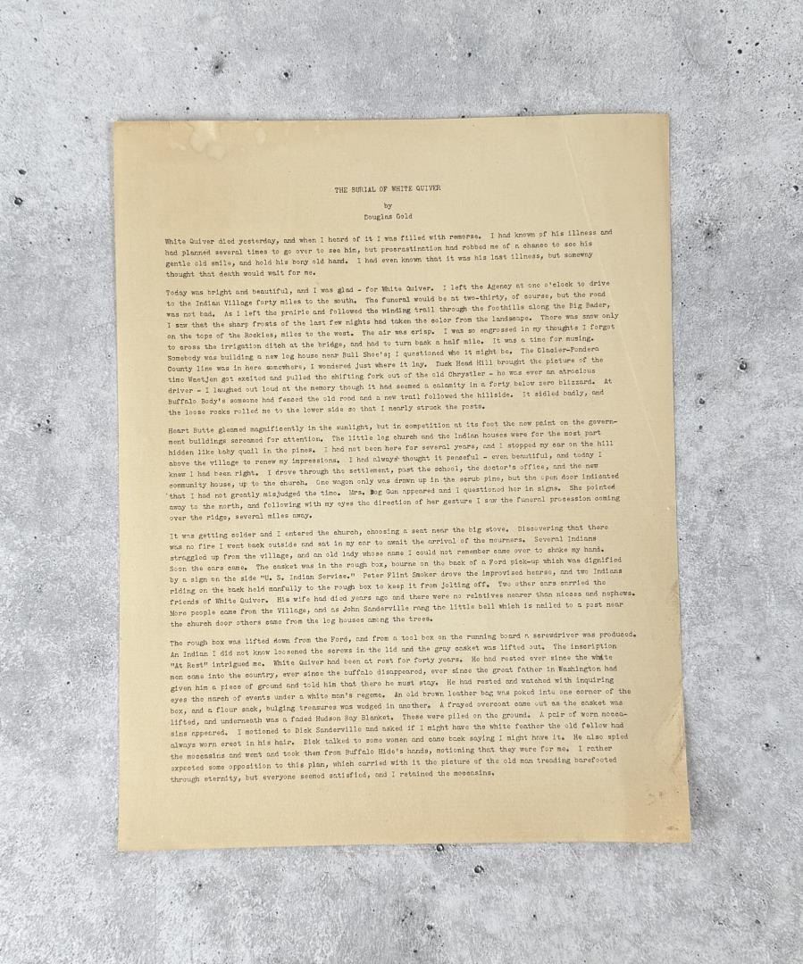 Interesting Letter/Story by Douglas Gold. Document relates to the Burial of an Indian Named White Quiver. Douglas Gold was the manager of the Transmountain Hotel Co. in Glacier National Park.