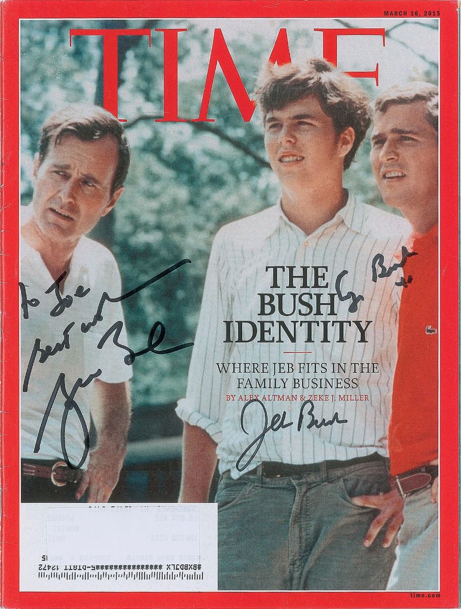Time magazine from March 16, 2015, 8 x 10.5, depicting an early image of George, Jeb, and George W. Bush on the front cover, signed and inscribed in black felt tip, “To Joe, Best wishes, George Bush,” “Jeb Bush,” and “G. Bush.” In fine condition. Accompanied by a full letter of authenticity from PSA/DNA.