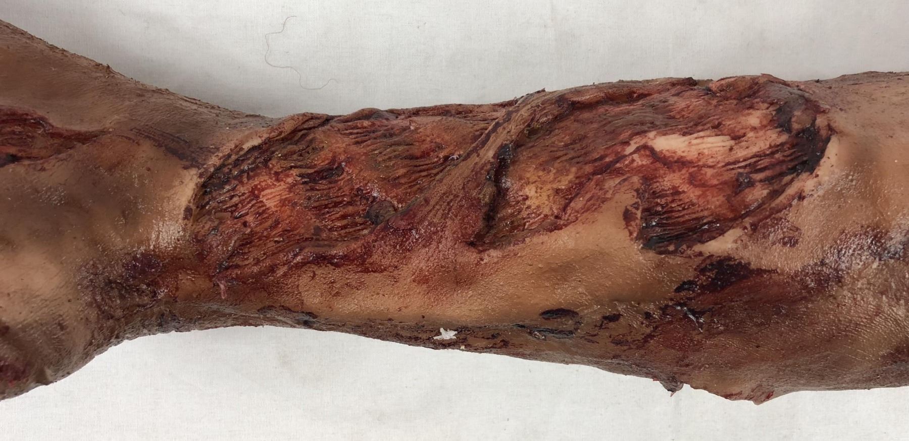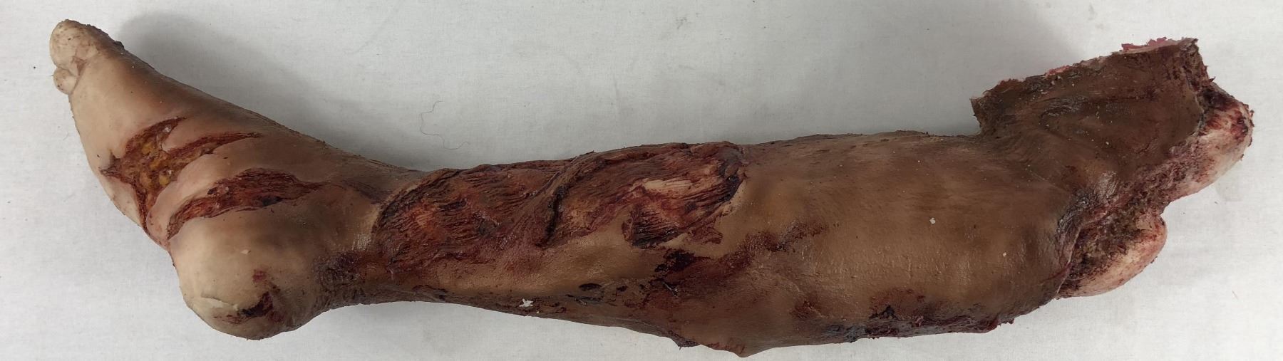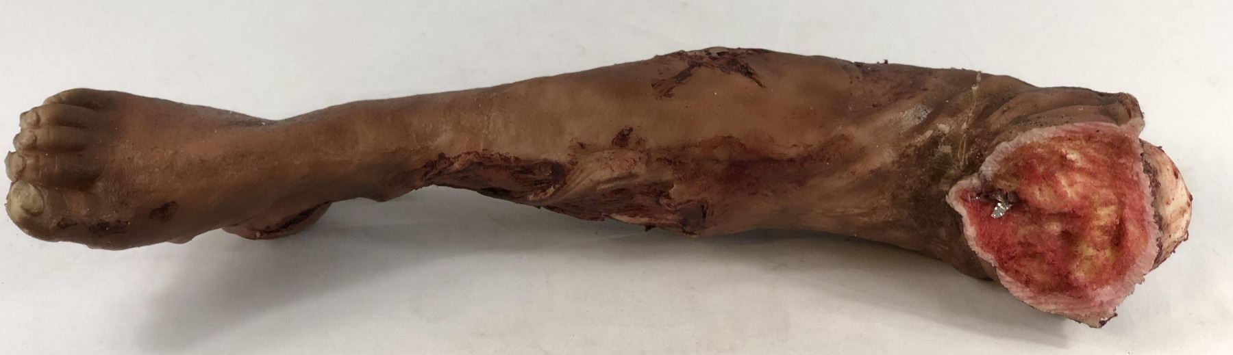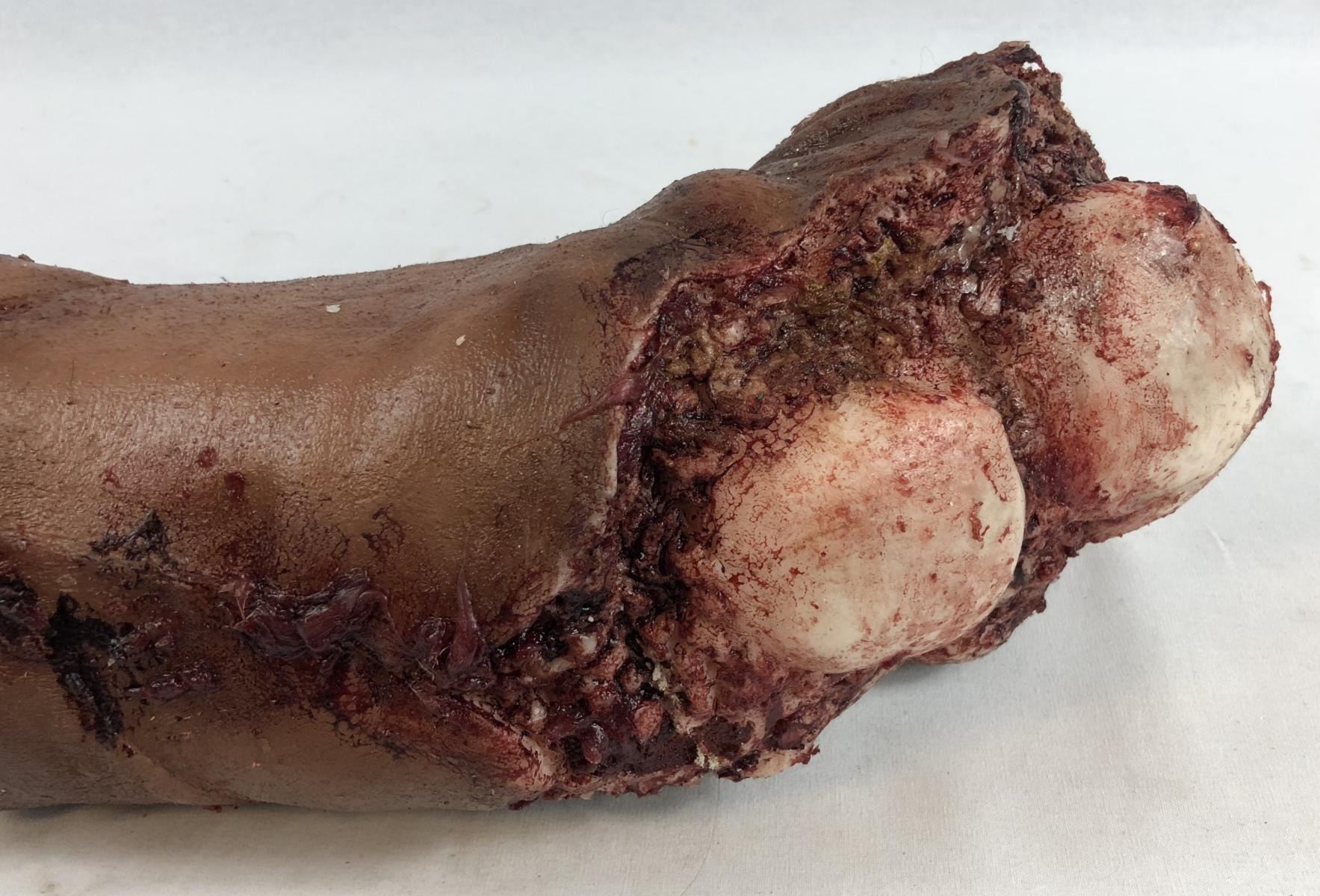 Made for FX scenes but unused lower leg made for the production of The Bye Bye Man, the supernatural horror film about three friends who stumble upon the horrific origins of a mysterious figure they discover is the root cause of the evil behind unspeakable acts.