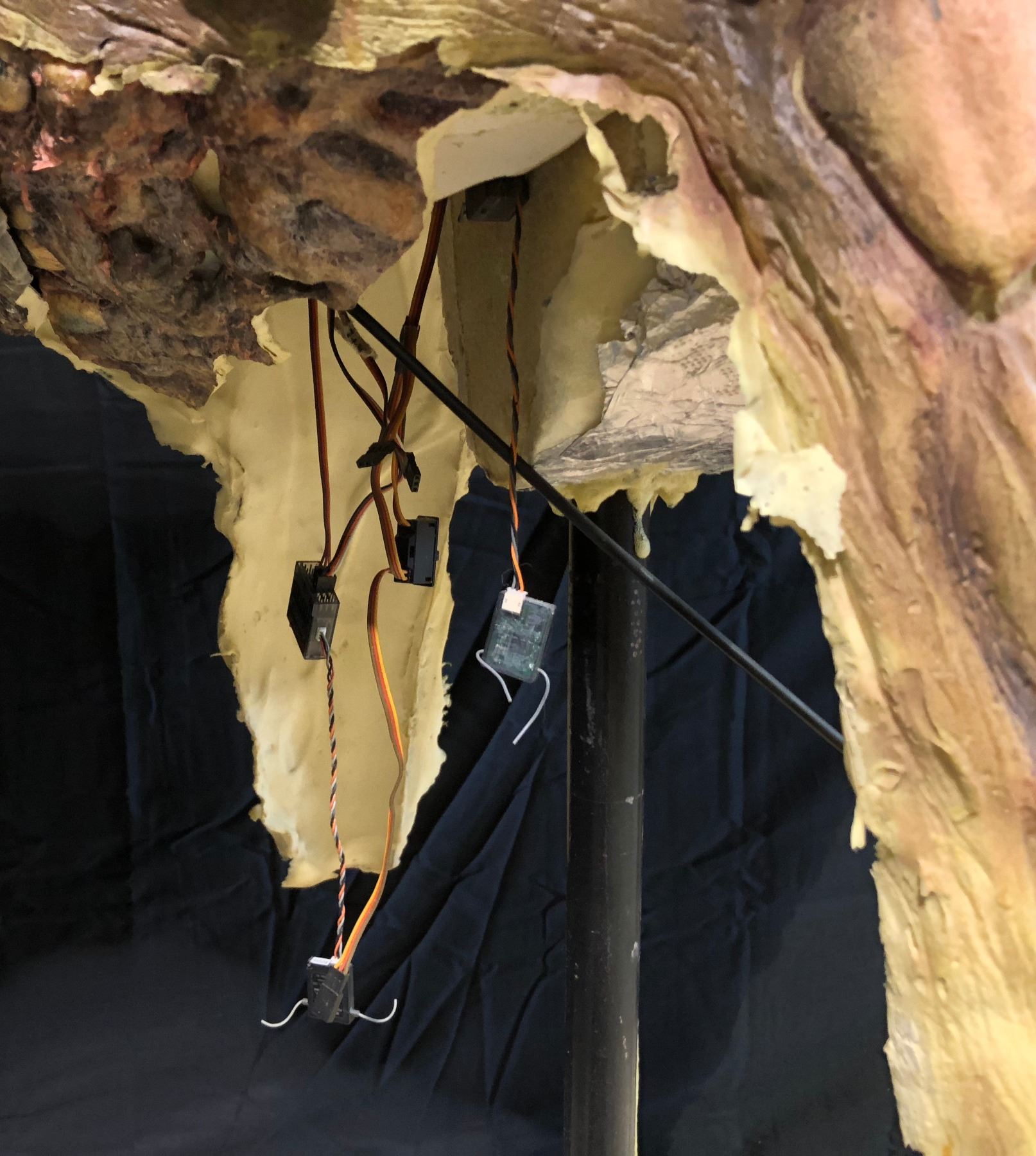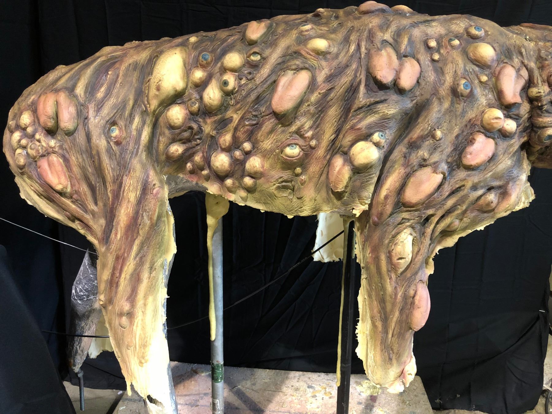 Foam body on metal rolling cart with latex outer cover, head has acrylic eyeballs which move when electronics are activated. Hand control, controls the mouth. Measures 4 foot from snout to end. 33 inches tall. 17 inches wide. Can be removed from cart if needed.