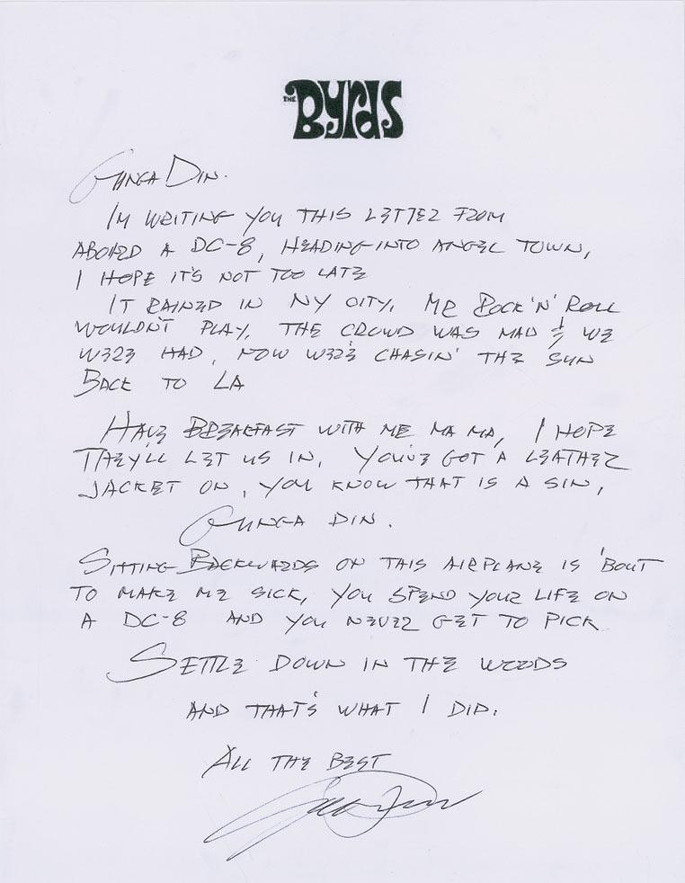 Handwritten souvenir lyrics to ‘Gunga Din,’ on an off-white 8.5 x 11 sheet of homemade Byrds stationery, signed at the conclusion by Parsons. In very fine condition.