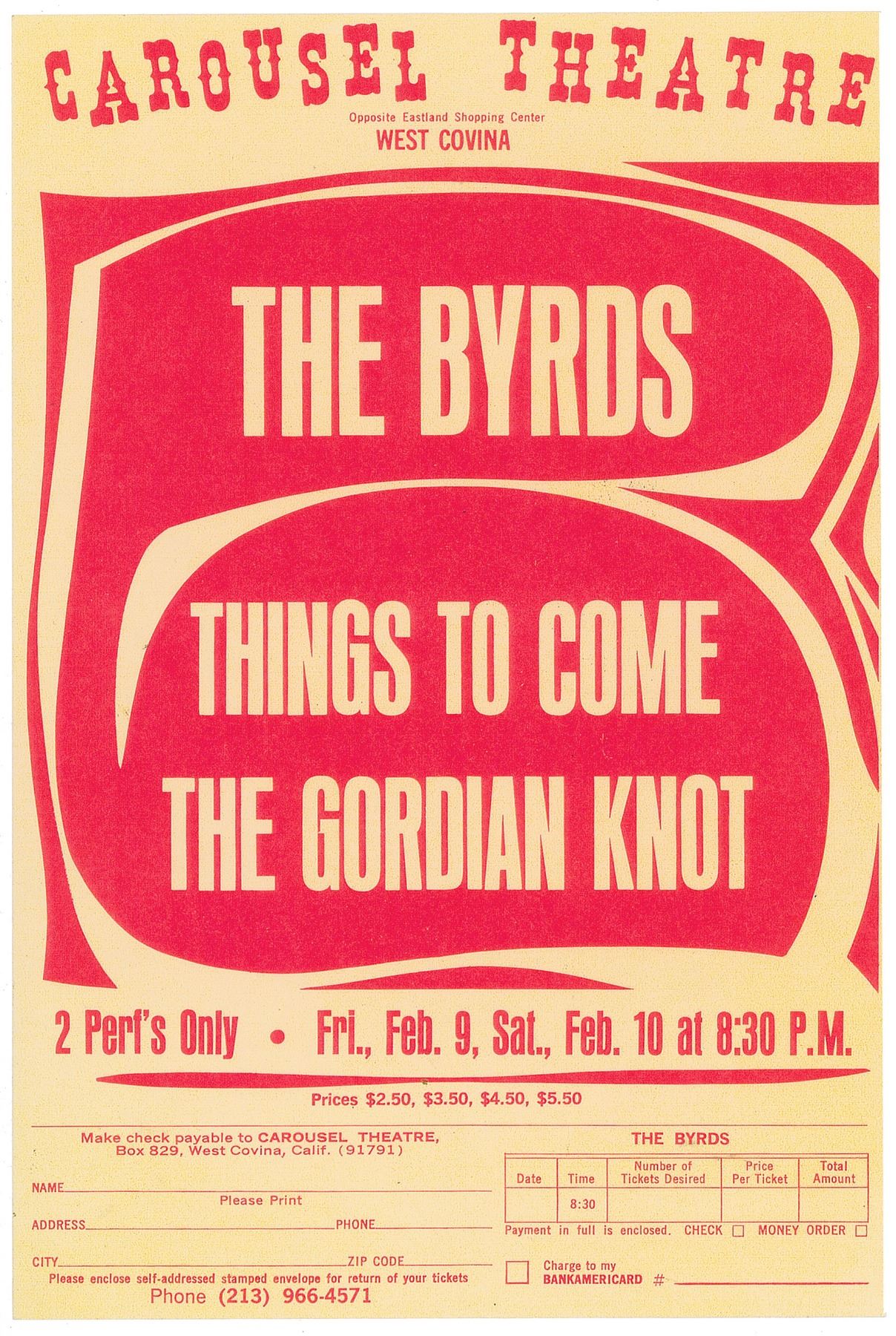 Rare red-and-yellow 6 x 9 handbill promoting two concerts for The Byrds at the Carousel Theater in West Covina, California, on February 9 and 10, 1966, with handbill listing Things to Come and The Gordian Knot as the opening acts. In fine condition. Accompanied by a signed certificate of authenticity from former Byrds road manager Jimmi Seiter, who affirms that the handbill comes from his personal collection.