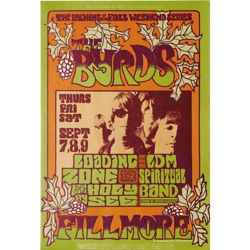 <B>The Byrds/Loading Zone Fillmore Concert Poster BG-82 (Bill Graham Presents, 1967).</B></I> This poster is marked "The Opening of the Fall Weekend Series", and features autumn colors and falling leaves to surround the inset photo of the Byrds. This colorful design was created by Jim Blashfield. The poster measures 14" x 21" and is in Near Mint condition.