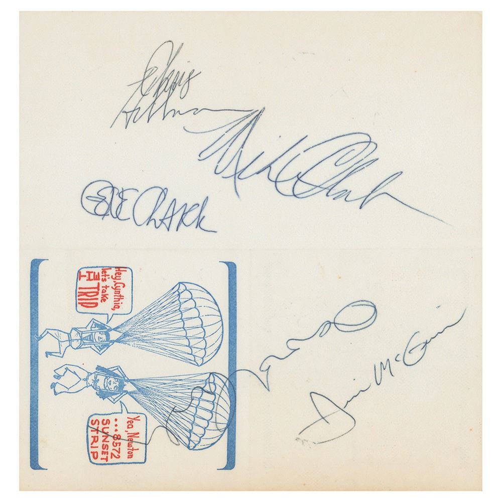 Vintage circa 1965-1966 ballpoint signatures of Roger McGuinn, Gene Clark, Chris Hillman, David Crosby, and Michael Clarke on an off-white 10.25 x 10 napkin from The Trip Club on 8572 Sunset Strip in West Hollywood, California, a club owned by Elmer Valentine and his parents, who also owned the nearby Whisky A Go Go. The Byrds played a number of early gigs at the shortlived Trip Club, which opened its doors in 1965 and closed just 13 months later. In fine condition.