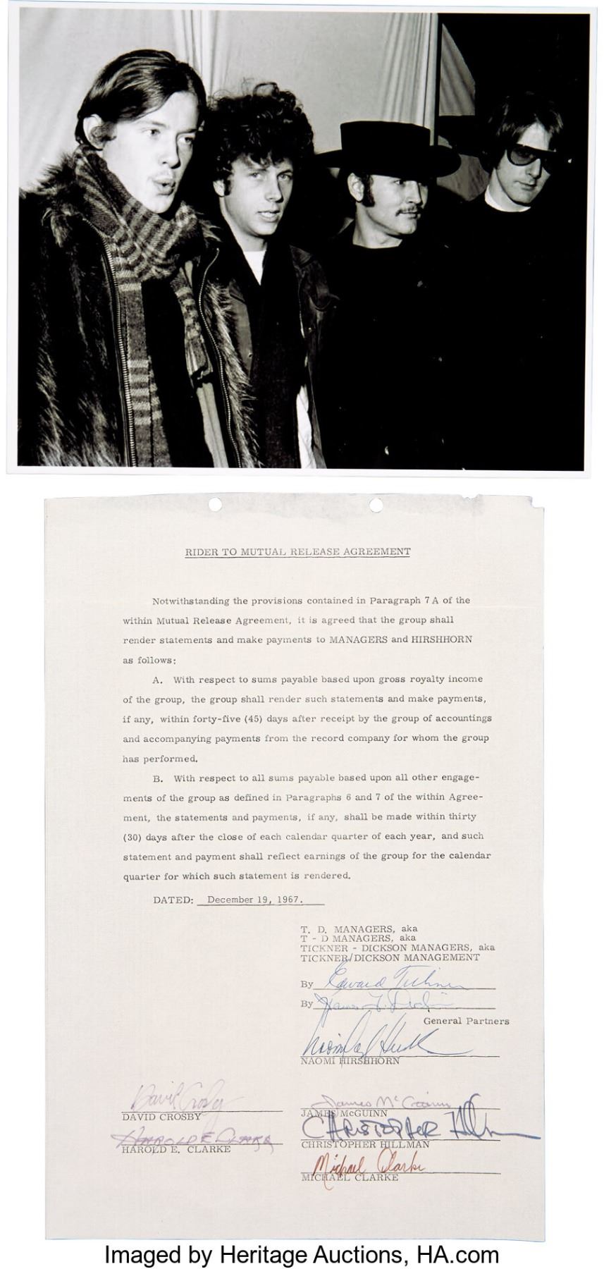 The Byrds Signed Performance Rider (1967). Titled "Rider to Mutual Release Agreement," this 1967 document is signed by five members of the Byrds in the bottom portion, under the signatures of their managers. Band member signatures include: David Crosby, Harold Clarke, Roger McGuinn (signed as "James McGuinn"), Christopher Hillman, and Michael Clarke. Measures 8 ½" x 12 ¾". In Very Good Plus condition with tears on the top of the page, along with a fold mark near the top portion. Contains print outs of the Never Beforealbum cover and a group shot for display purposes. COA from Heritage Auctions.