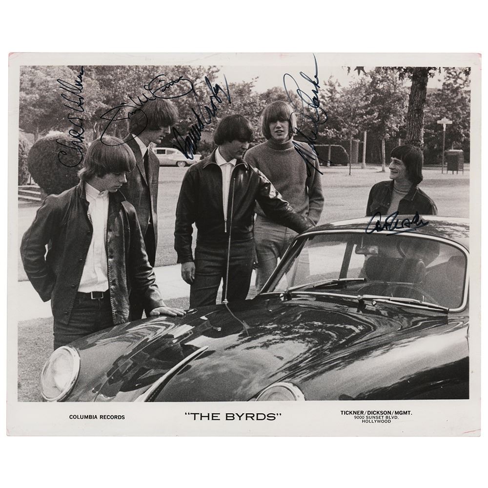 Glossy 10 x 8 Columbia records publicity photo of The Byrds admiring a new automobile, signed in black felt tip by Roger McGuinn, who signs as "Jim," Gene Clark, Chris Hillman, and David Crosby. In very good to fine condition, with a diagonal crease to the upper left corner, and another crease which passes through Clarke's face.
