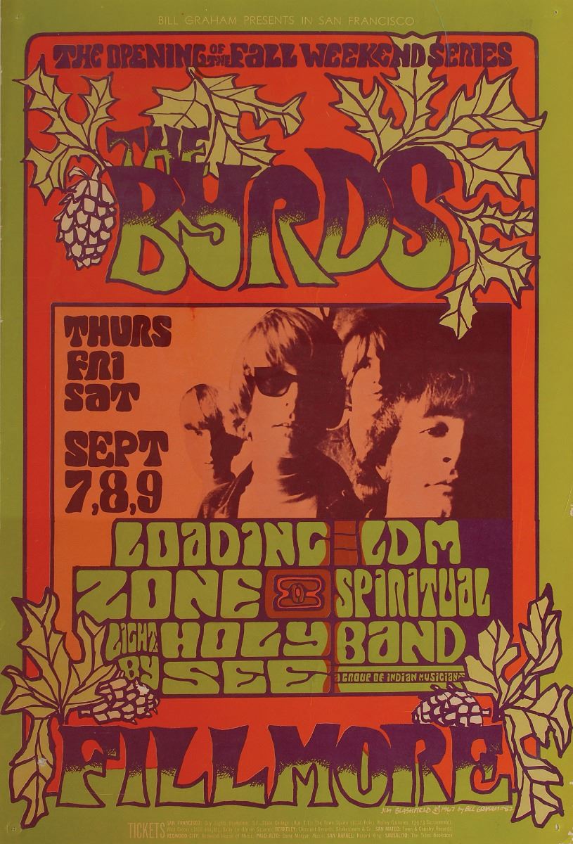 Autumnally colored 14 x 21 concert poster designed by artist Jim Blashfield for a series of performances by The Birds at San Francisco’s Fillmore Auditorium on September 7-9, 1967, showing an image of the group and listing Loading Zone, Lights by Holy See, and LDM Spiritual Band as the supporting acts. Some scattered creases, slight edgewear, and holes to corners, otherwise fine condition.