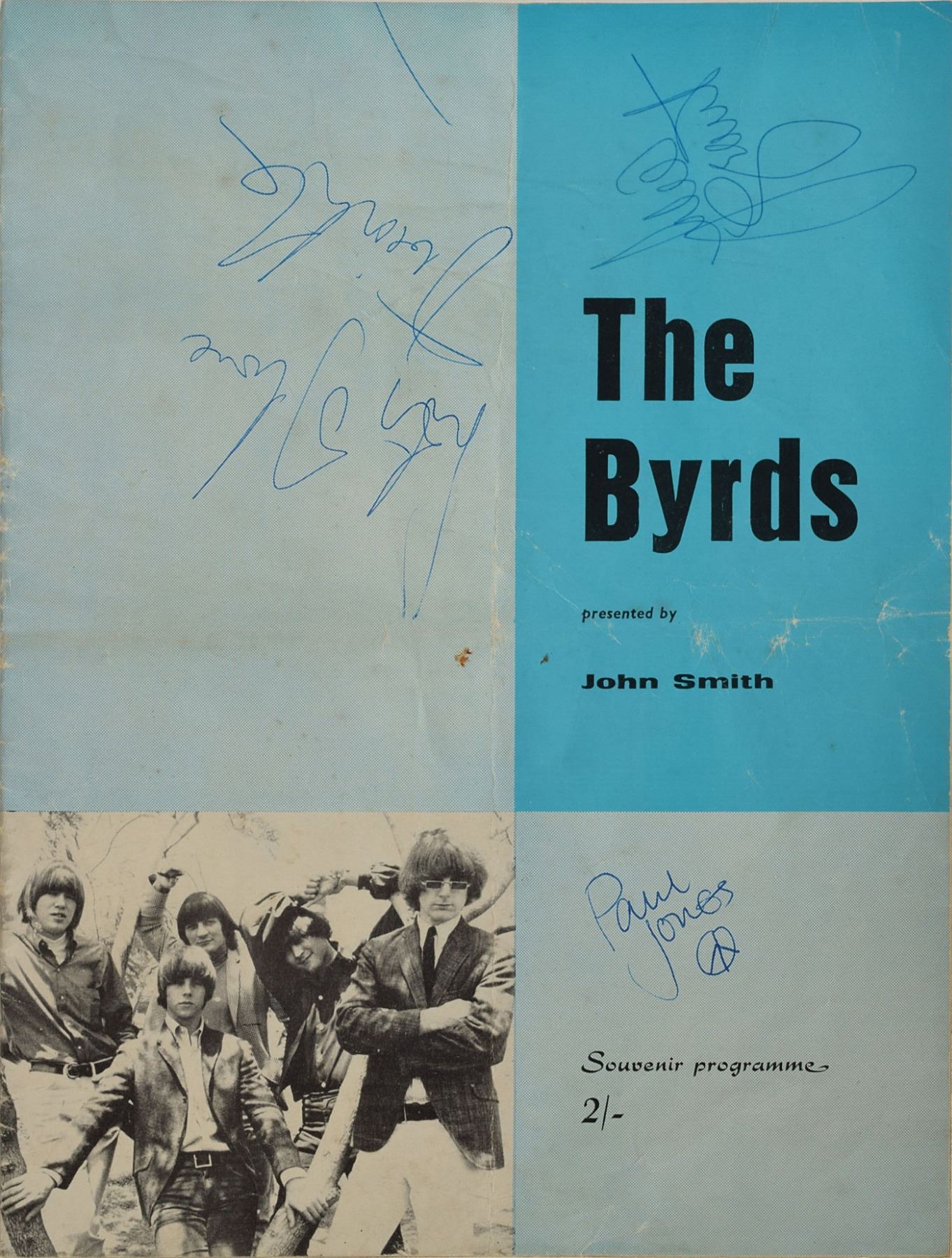 Vintage UK souvenir program for The Byrds, promoting a pair of concerts in August 1965, at Fairfield Hall in Croydon and at Guildhall in Portsmouth, 8 x 10.5, signed inside in blue ballpoint over their respective images by Chris Hillman, Jim McGuinn, Gene Clark, Mike Clark, and David Crosby. The program is also signed by members of The Quiet Five, Perry Ford and John Carter of The Ivy league, Christine Quaite, and others. Also includes a pair of off-white slips signed in ink or felt tip by members of The Quiet Five. In very good to fine condition, with intersecting folds and handling wear to the program.