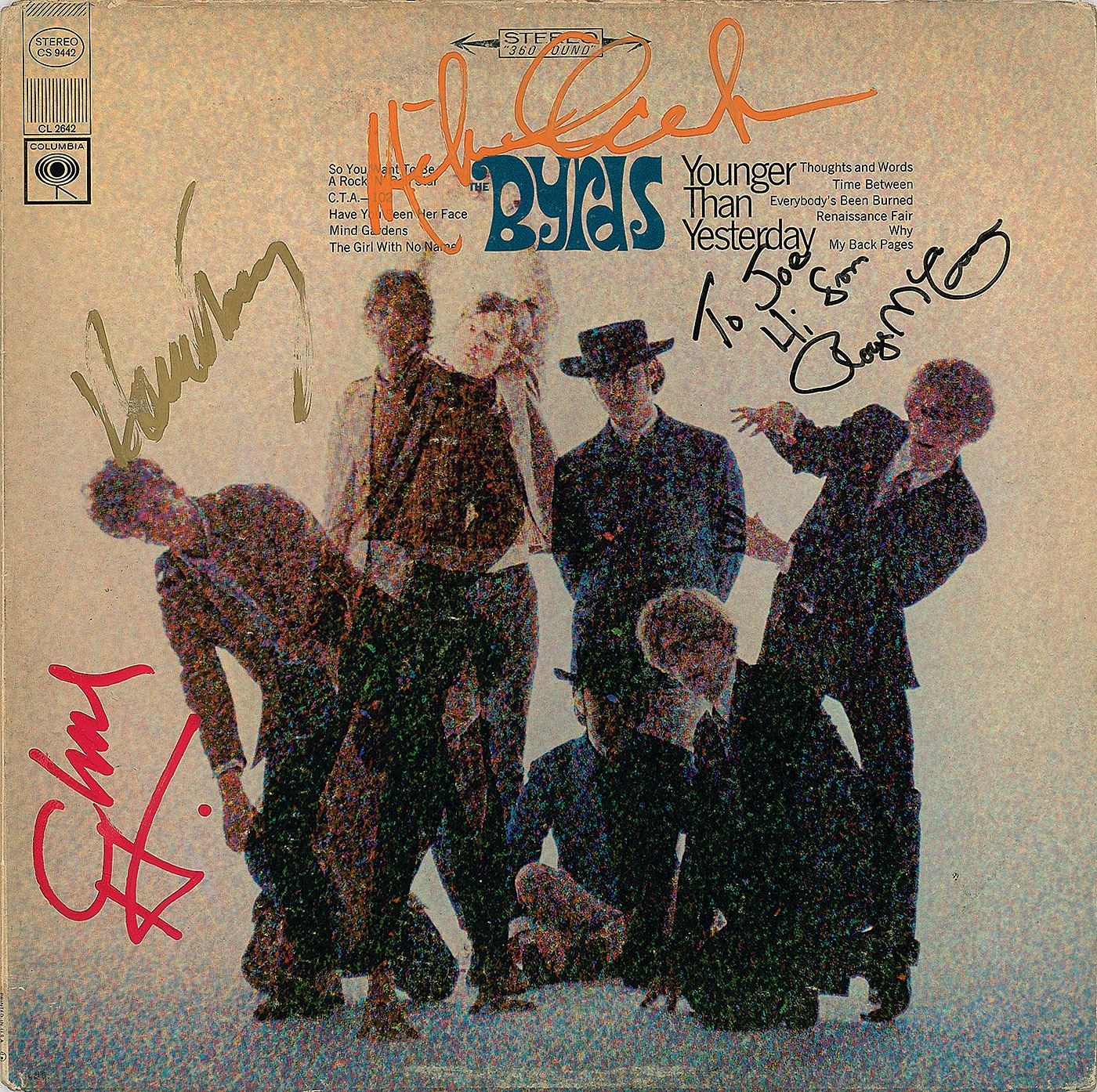 Younger Than Yesterday album signed and inscribed on the front cover in various ink types, "To Joe, Hi from, Roger McGuinn," "David Crosby," "Michael Clarke," and "Chris Hillman." Also included is a silver ink signature, "Gene Clark, byrds," on an off-white 4 x 2.75 clipped card. In overall fine condition, with smudging to the Clark signature. The record is included. Consignor notes that the signatures were obtained in person.