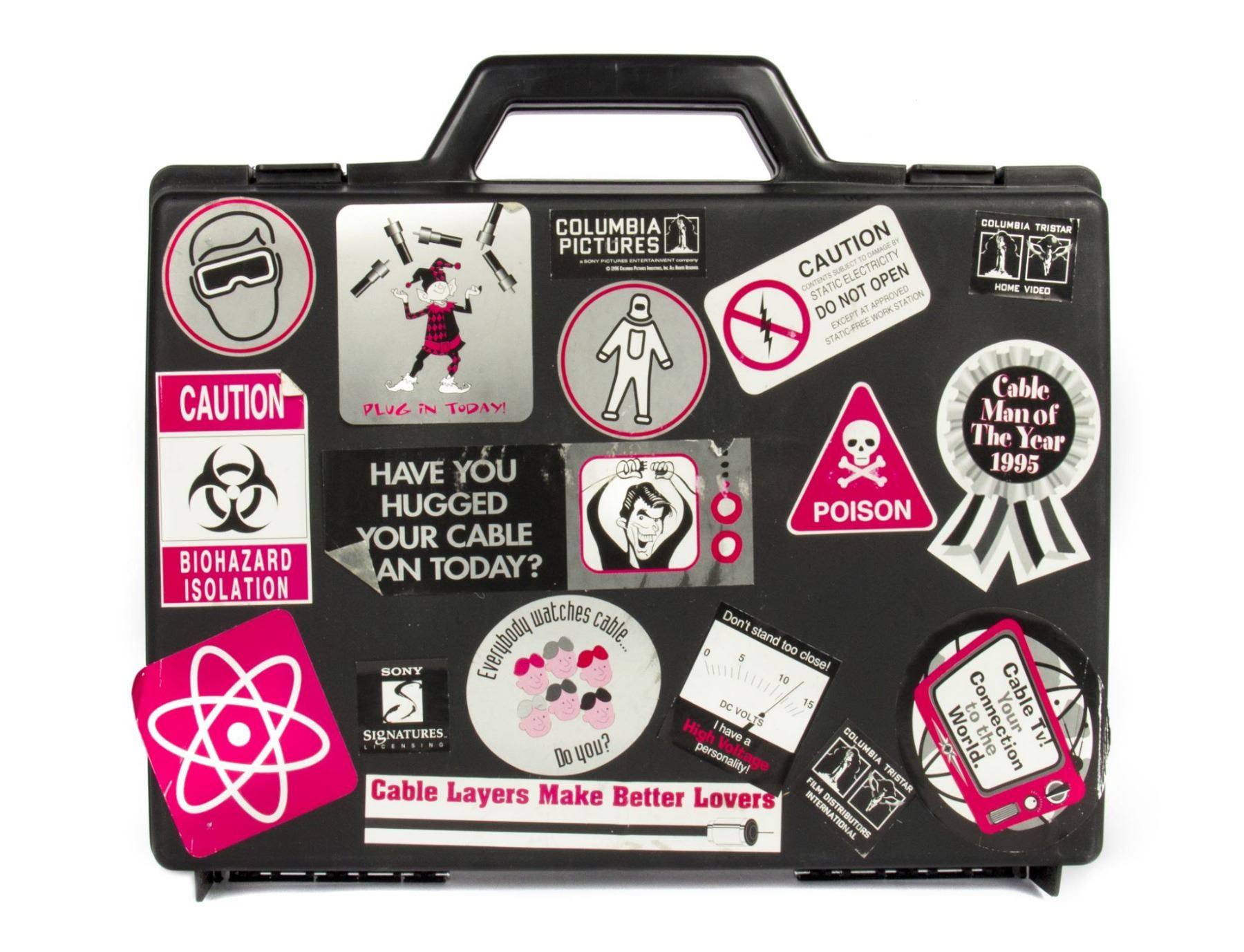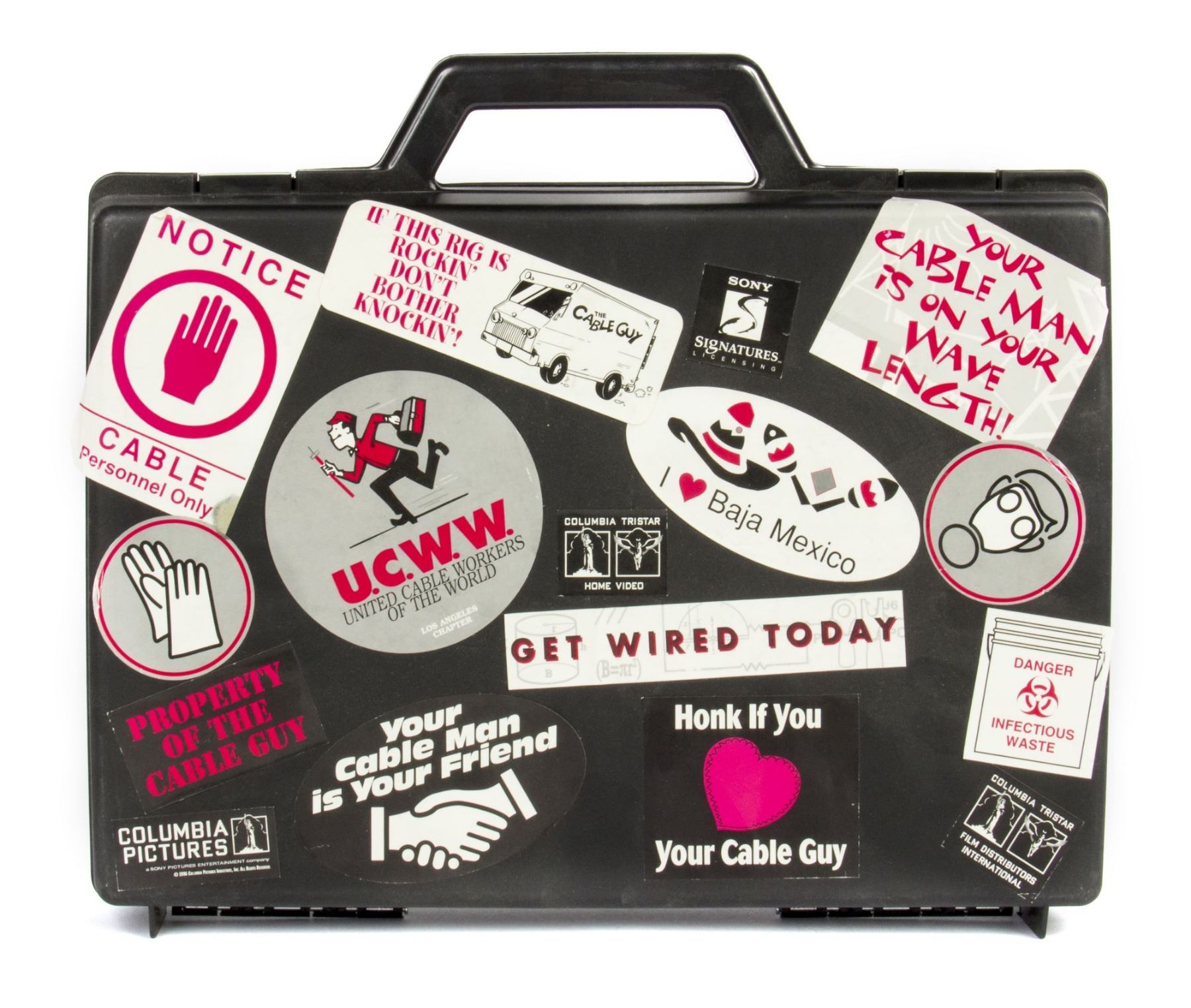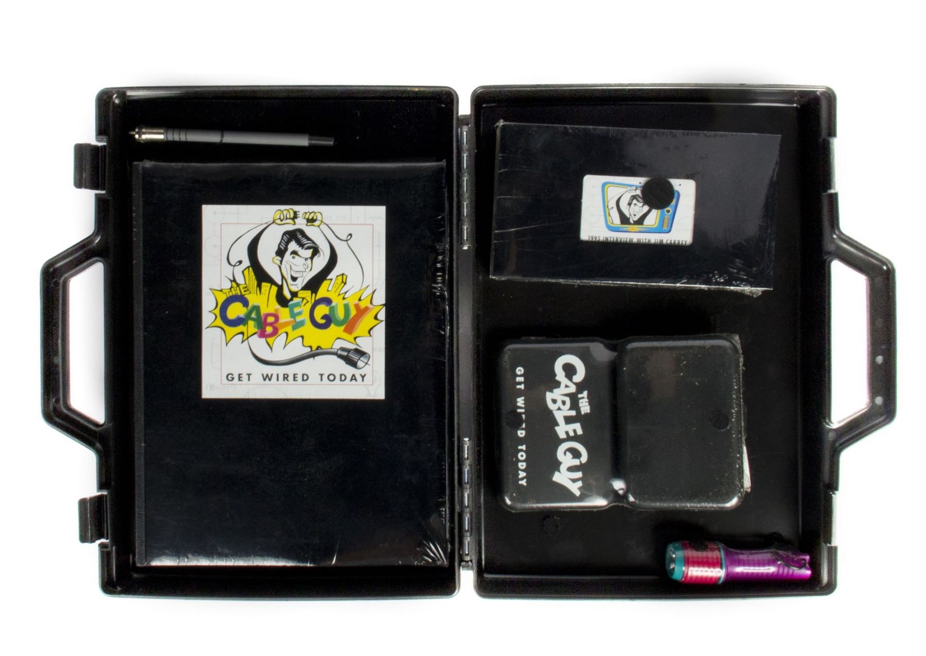 (Columbia, c.1996) A rare boxed press kit in the shape of a tool box that was created to promote the feature film "The Cable Guy". This intricately designed press kit comes in a hard-plastic case with stickers on both sides that reference the film. Inside, the kit includes a VHS tape of an interview with Jim Carrey, a "The Cable Guy" script, a pen shaped like a TV cable, a themed post-it pad, a mini tool kit, and a flashlight. All of the items inside the kit are unused and sealed in their original plastic wrapping. The overall dimensions of the case are 12"x13.5" and 2.75" thick. The condition is good overall with some lifting to some of the stickers, and some minor tearing to portions of the plastic wrap on a few of the items.