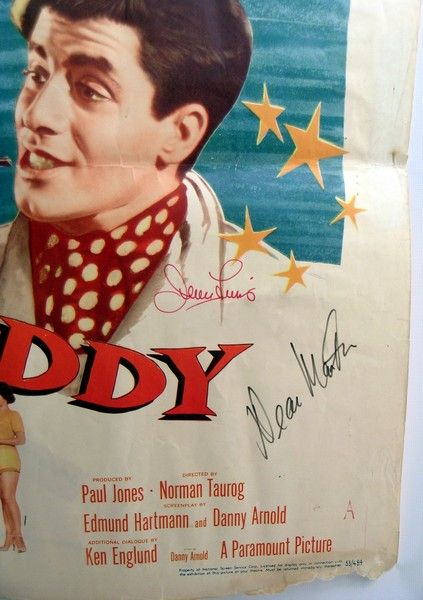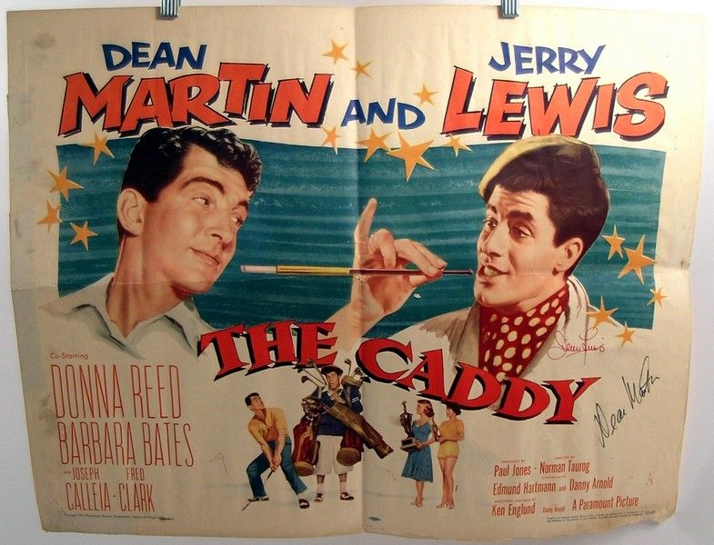 The hottest comedy team in Hollywood was without a doubt, Jerry Lewis and Dean Martin, who had a sensational ten year run. At the height of their popularity they made "The Caddy" (1953) with their own production company. It was a massive box office smash, and also introduced to the world Martin's trademark song "That's Amore". This is an original theatrical poster from the movie, signed by both Dean Martin and Jerry Lewis. It is in good condition, showing normal patina aging, and has some age-damage to the lower right hand corner and some boarder edge tears, as well as standard fold marks. Approx 28"x22"