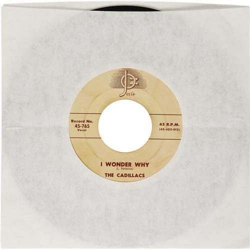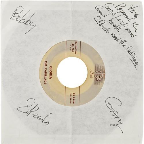 <B>The Cadillacs "Gloria" 45 Josie 765 (1954).</B></I> The first single for the famed vocal group, best known for "Speedoo" which came out the next year. Flip side is "I Wonder Why." On initial review, the label on the "Gloria" side appears stained, but closer inspection makes us think of a printing/pressing anomaly. The record comes from the collection of Reno DJ, "The Rockin' Reverend" (Rev. Ken Haskins), who had original members Earl "Speedoo" Carroll and Robert Phillips, plus more recent addition "Gary", autograph the record sleeve. Check it out online! Condition: EX 7.