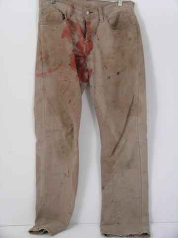 Michael Foster (Michael Eklund) screen worn, hero, very bloody and distressed with dirt, grey short sleeve crew neck 'Fruit of the Loom' t-shirt, (size M) and very bloody and worn with dirt, khaki 'Levi Strauss' pants. (size 31) Includes wardrobe tag!