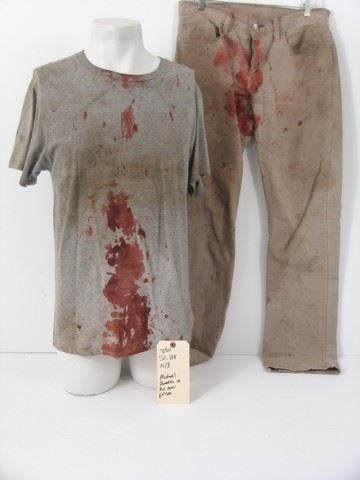 Michael Foster (Michael Eklund) screen worn, hero, very bloody and distressed with dirt, grey short sleeve crew neck 'Fruit of the Loom' t-shirt, (size M) and very bloody and worn with dirt, khaki 'Levi Strauss' pants. (size 31) Includes wardrobe tag!