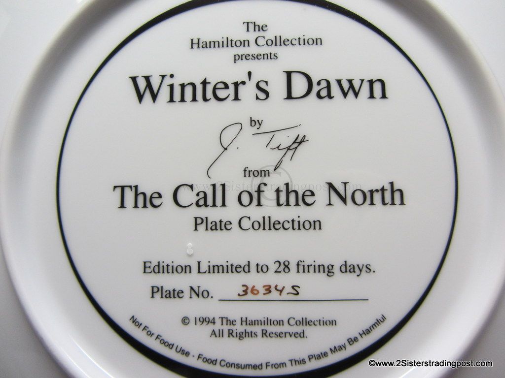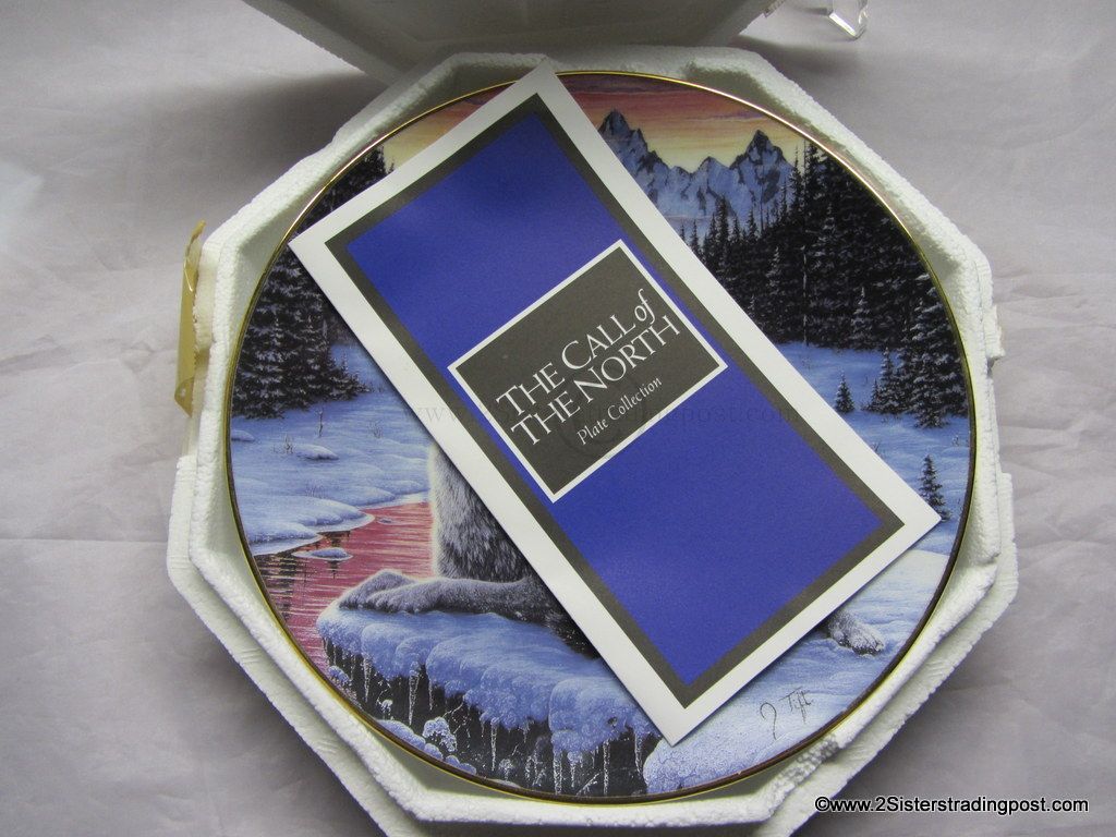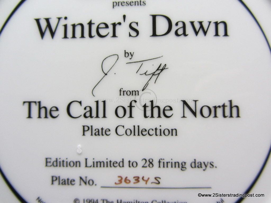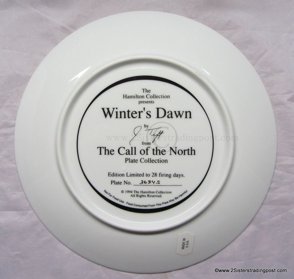 The Call of the North Plate Collection art work by Jeff Tift titled "Winter's Dawn". The plate is in the original Styrofoam packing and has the Certificate of Authenticity. Plate is from the Hamilton Collection and was limited to a 28 firing says plate #3634S.