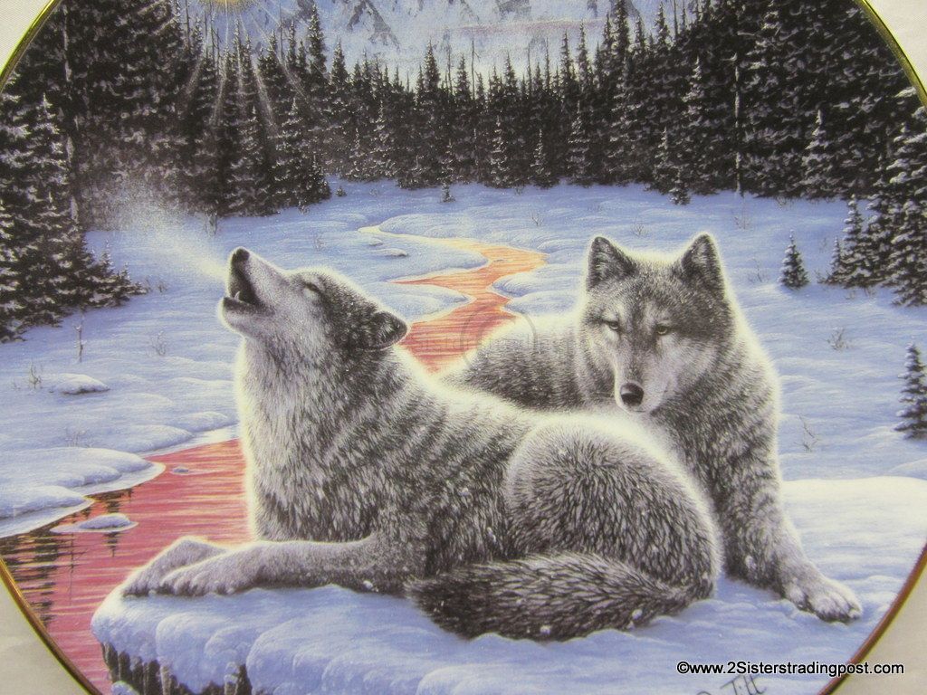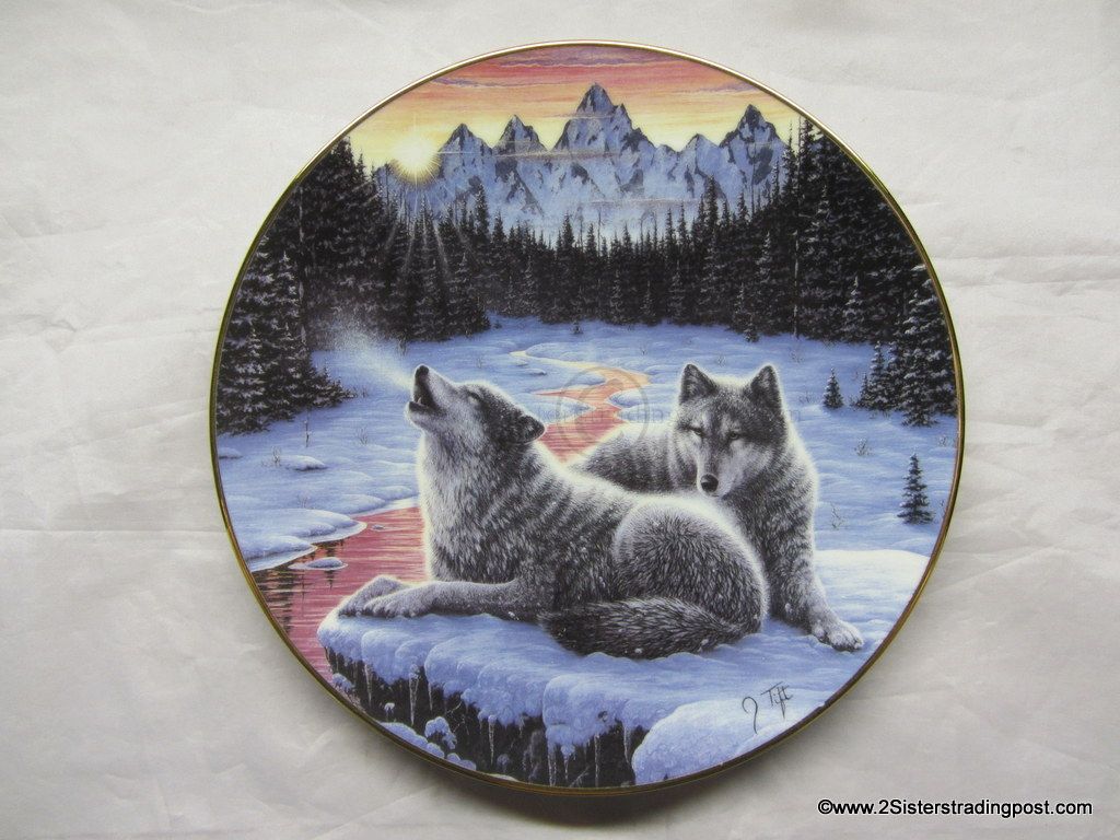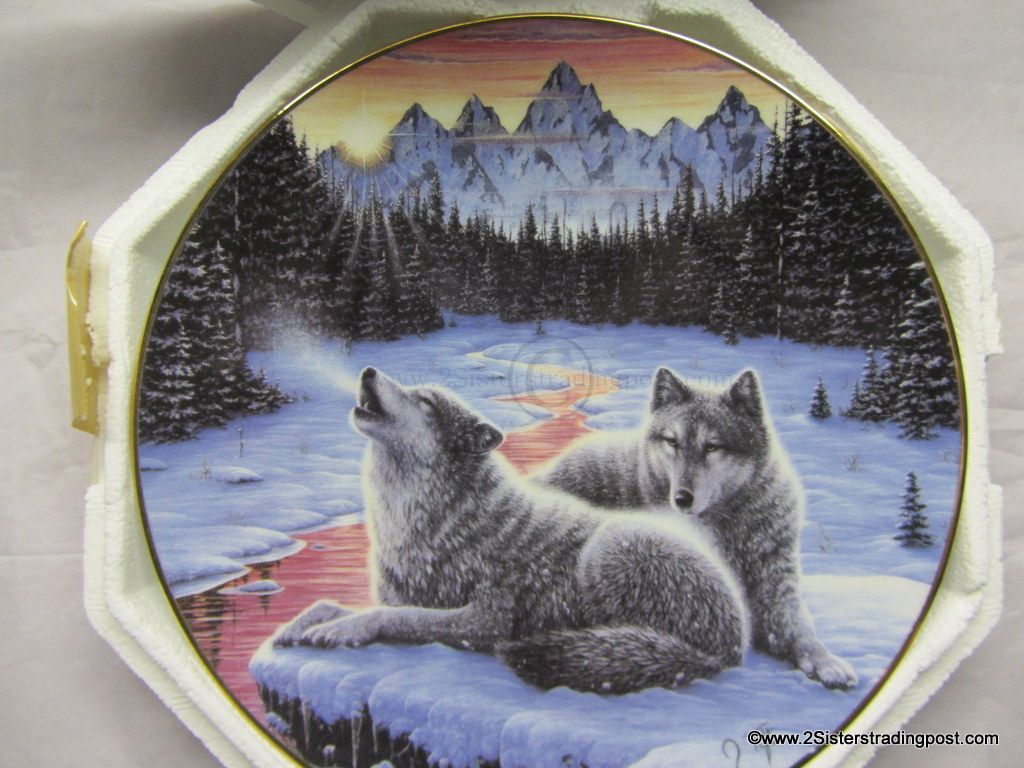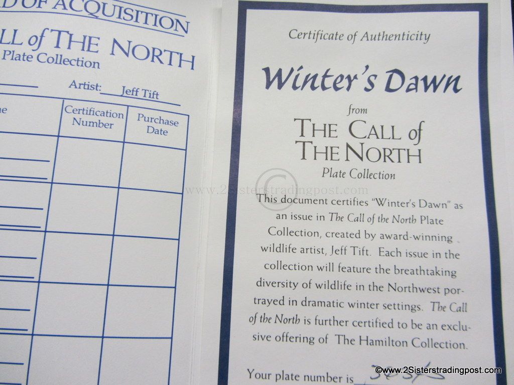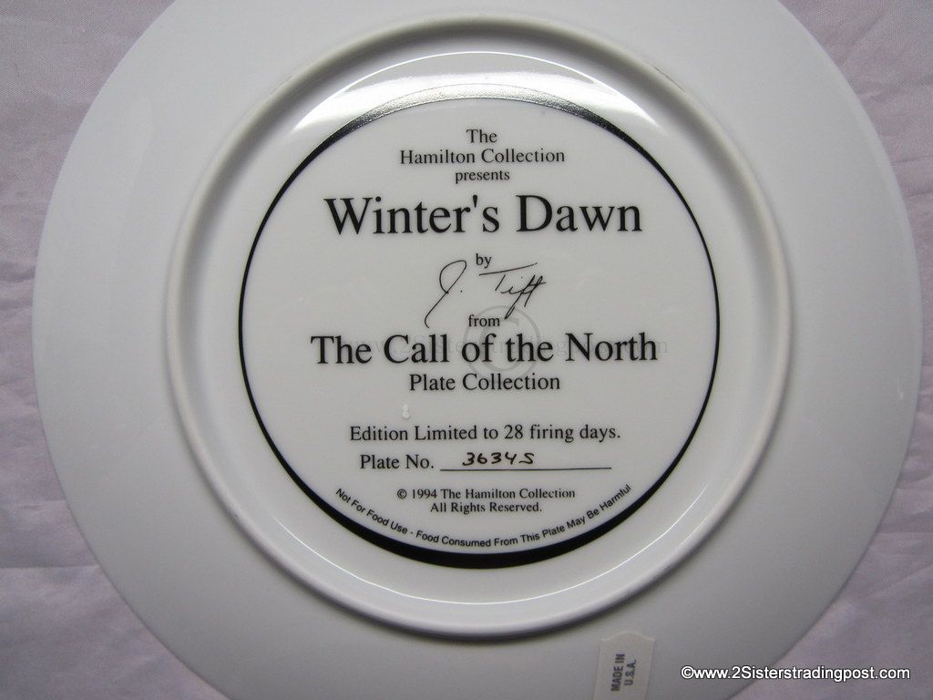 The Call of the North Plate Collection art work by Jeff Tift titled "Winter's Dawn". The plate is in the original Styrofoam packing and has the Certificate of Authenticity. Plate is from the Hamilton Collection and was limited to a 28 firing says plate #3634S.