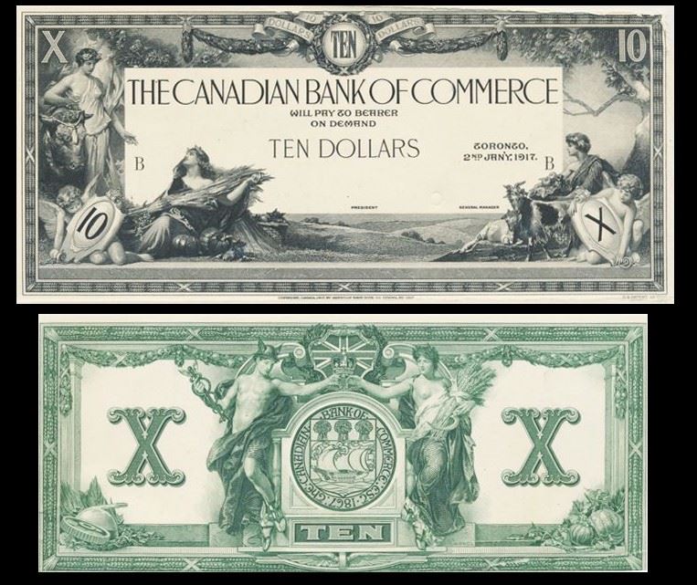 The Canadian Bank of Commerce. $10.00. Jan. 2, 1917. CH-75-16-02-06P. Green and White Face and Back Proofs. The proofs have been made from cancelled dies. Both have folds and other defects.