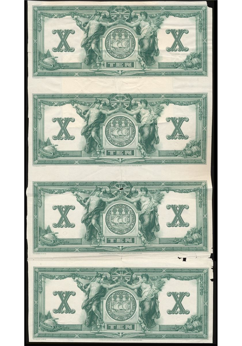 The Canadian Bank of Commerce. $10.00. Jan. 2, 1935. CH-75-18-06P. An uncut sheet of four Back Proofs in olive green tint, attached vertically, on thin paper. The Proofs have been printed from cancelled dies and have been folded down the middle and there are a few minor defects, otherwise the sheet is Extra Fine.