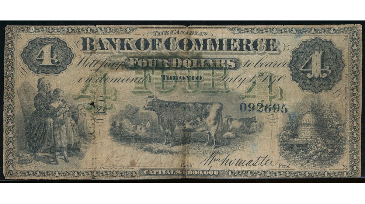 The Canadian Bank of Commerce; 1870 $4 #092695, CH-75-10-06 & International Bank $5 #2161 CH-380-10-10-02. Lot of 2 notes both VG but with problems. Both notes show internal tears and rim issues, with the $4 showing tape repair on back. Catalogue for grade $2675 but estimate based on condition. Should be viewed.