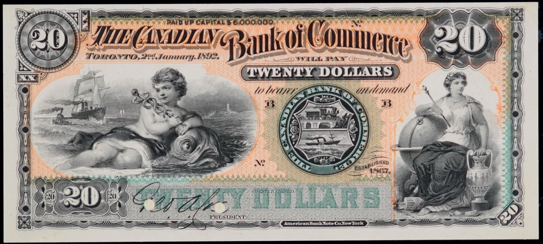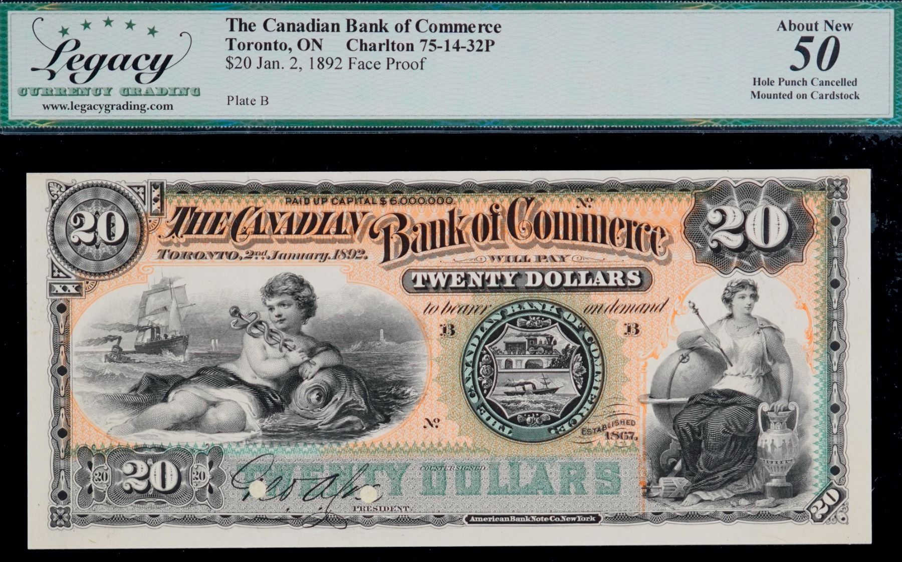 The Canadian Bank of Commerce 1892 $20 CH-75-14-32P Legacy Currency Grading About Uncirculated-50, edge tear at top