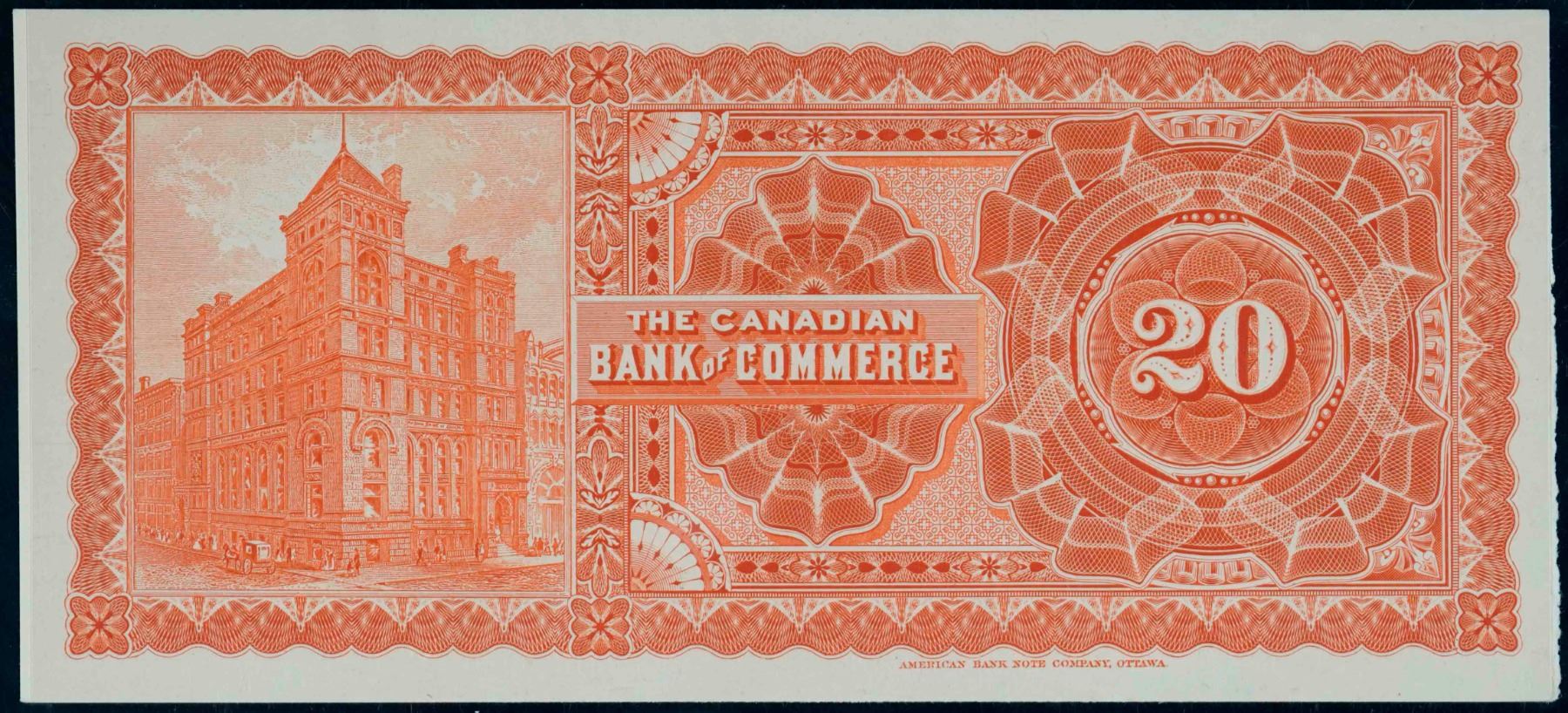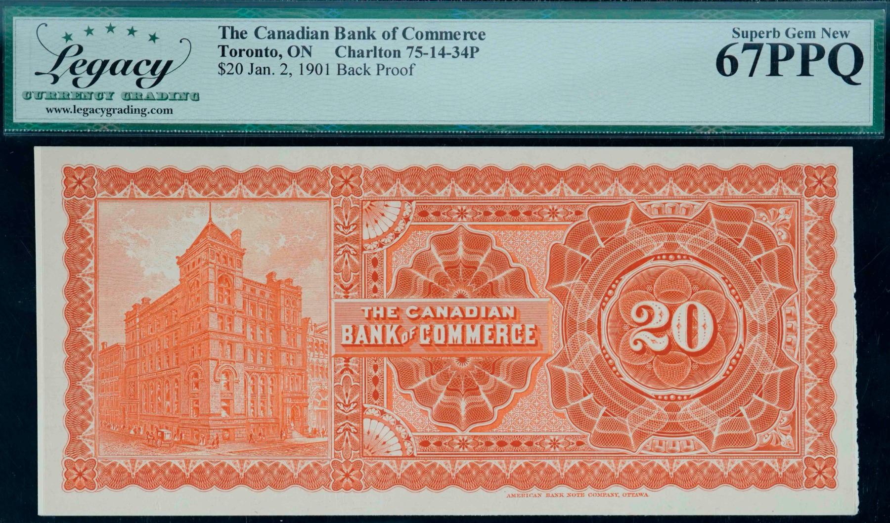 The Canadian Bank of Commerce; 1901 $20 CH-75-14-34BP, PMG Superb Gem Uncirculated-67PPQ. A Superb Coloured Back Proof issue.