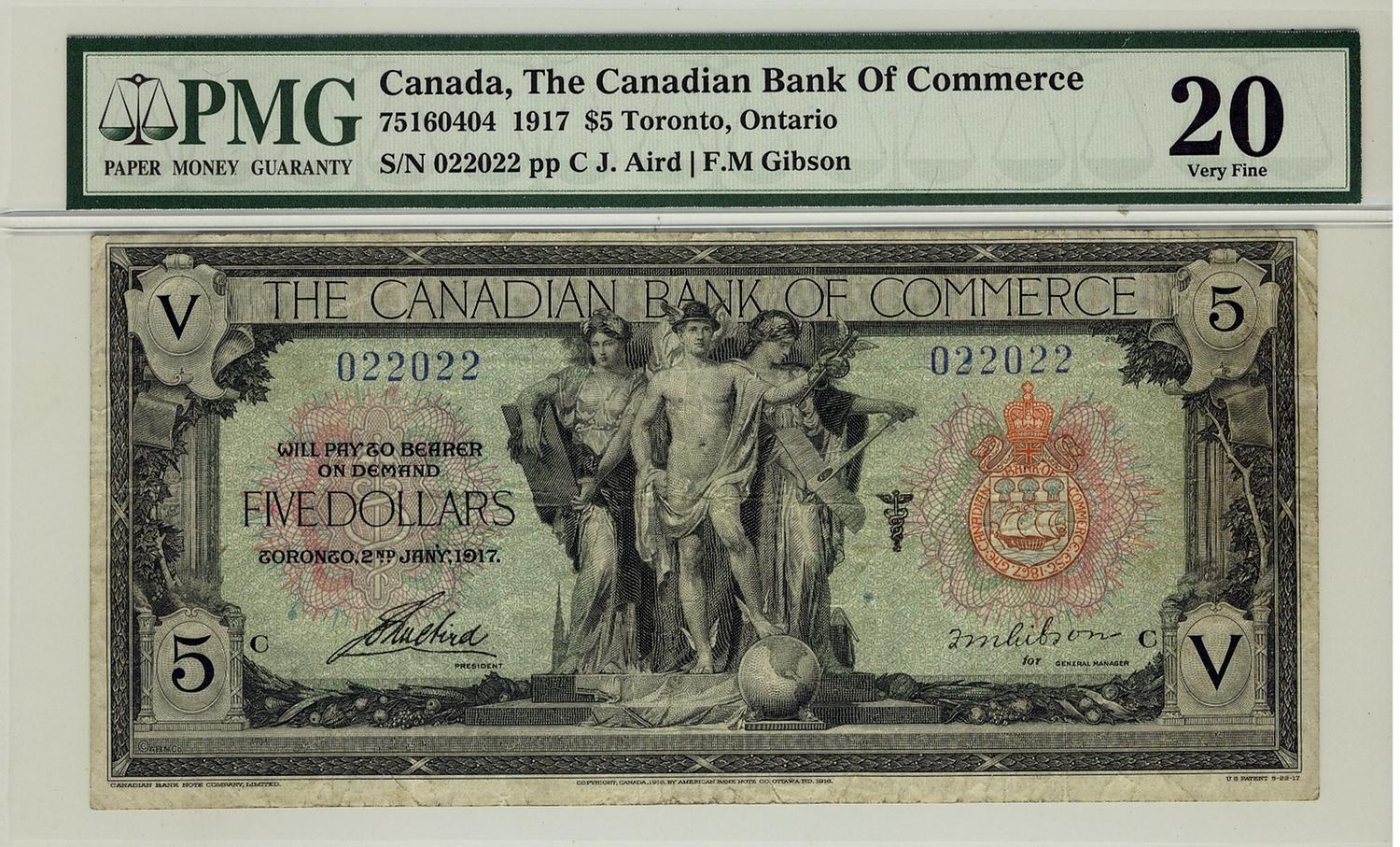 The Canadian Bank of Commerce, 1917 $5 #022022, CH-75-16-04-04 PMG VF20. Rare GIBSON signature. Only 12 known.