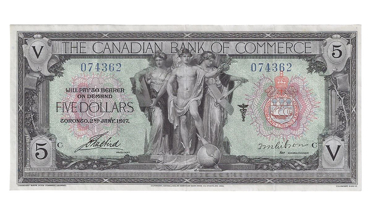 The Canadian Bank of Commerce, 1917 $5 #074362 CH-75-16-04-04 VF35. Gibson signature. Very bright and clean. Scarce this nice.