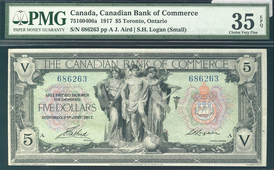 The Canadian Bank of Commerce 1917 $5 #686263 CH-75-16-04-06a PMG CH VF35EPQ. A choice example. Bright.