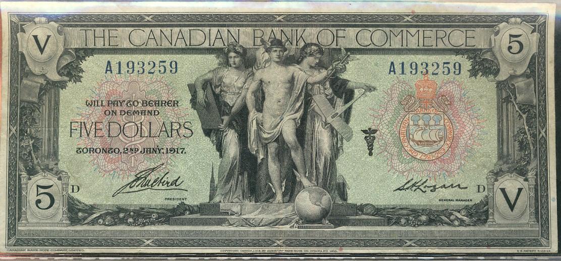 The Canadian Bank of Commerce 1917 $5 #A193259 CH75-16-04-12b. VF in grade.