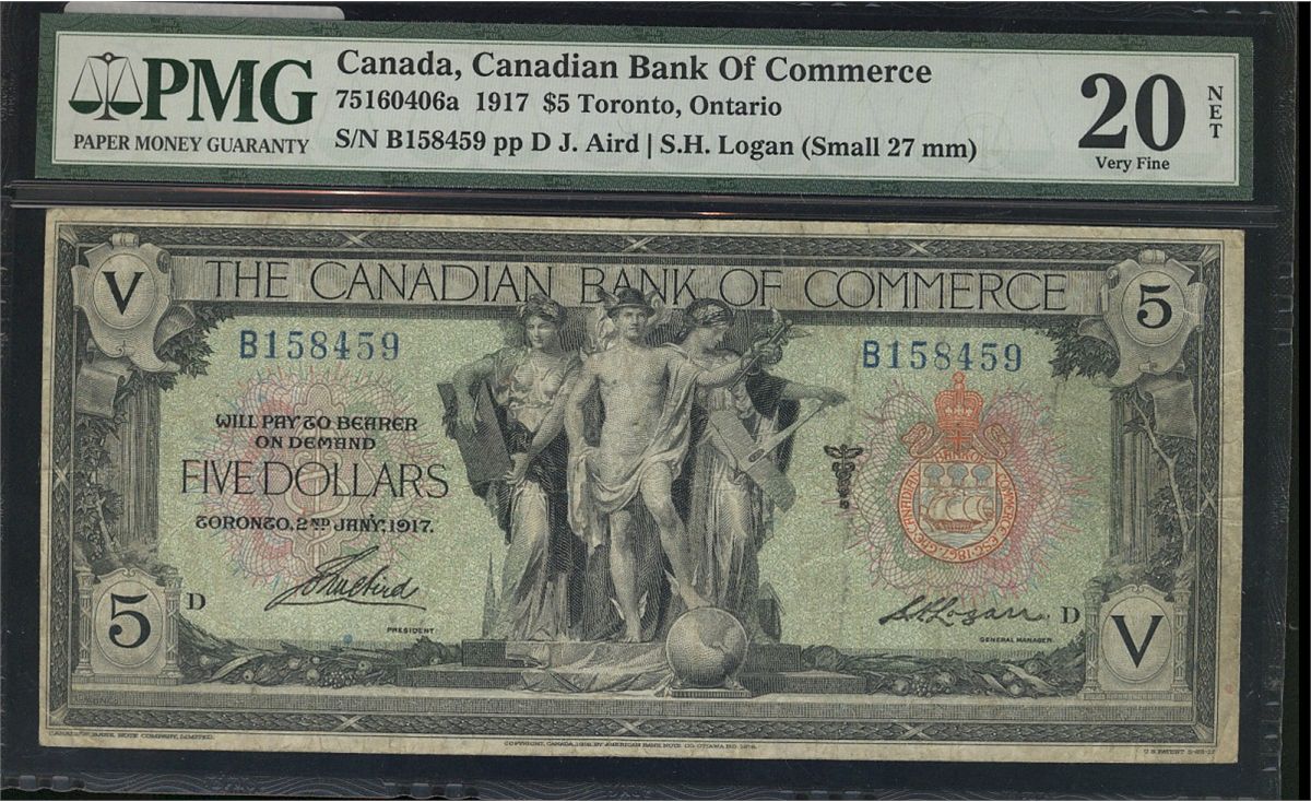 The Canadian Bank of Commerce 1917 $5 #B158459 CH-75-16-04-06a. PMG VF20 Net. Very minor rust mark.