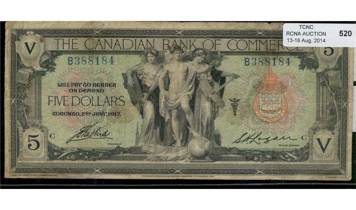 The Canadian Bank of Commerce; 1917 $5 #B388184, CH-75-16-04-12b. Fine with minor rim issues and light staining.