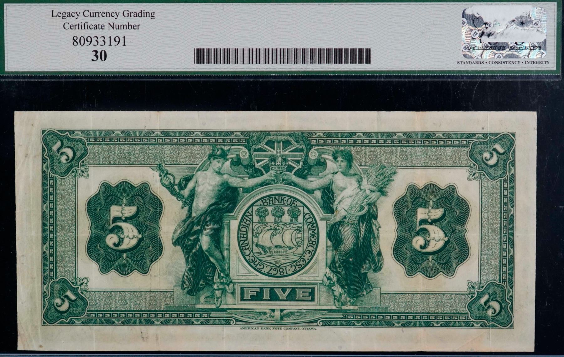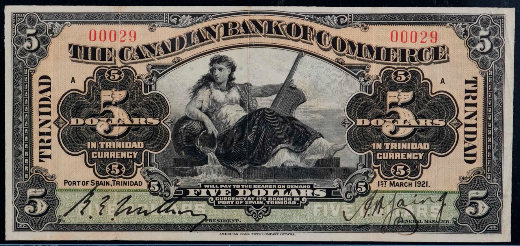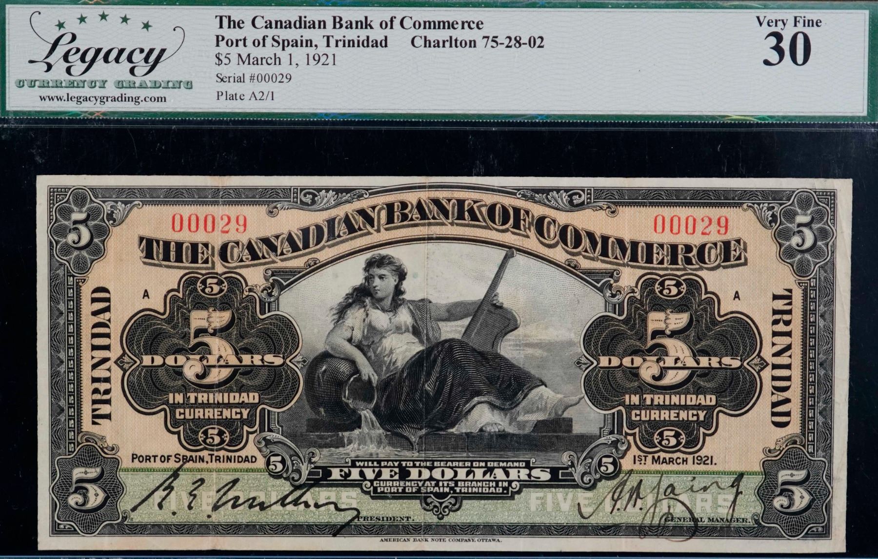 The Canadian Bank of Commerce; 1921 $5 #00029 "TRINIDAD" - "LOW NUMBER" CH-75-28-02, Legacy Currency Grading Choice Very Fine-30. A very attractive and rare example. Not priced above VF grades. Rare.