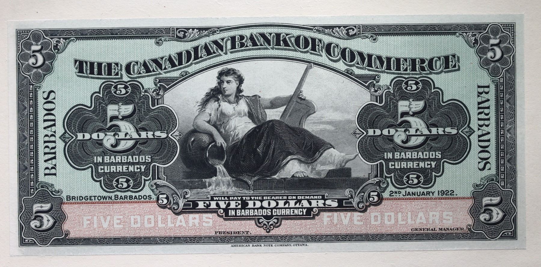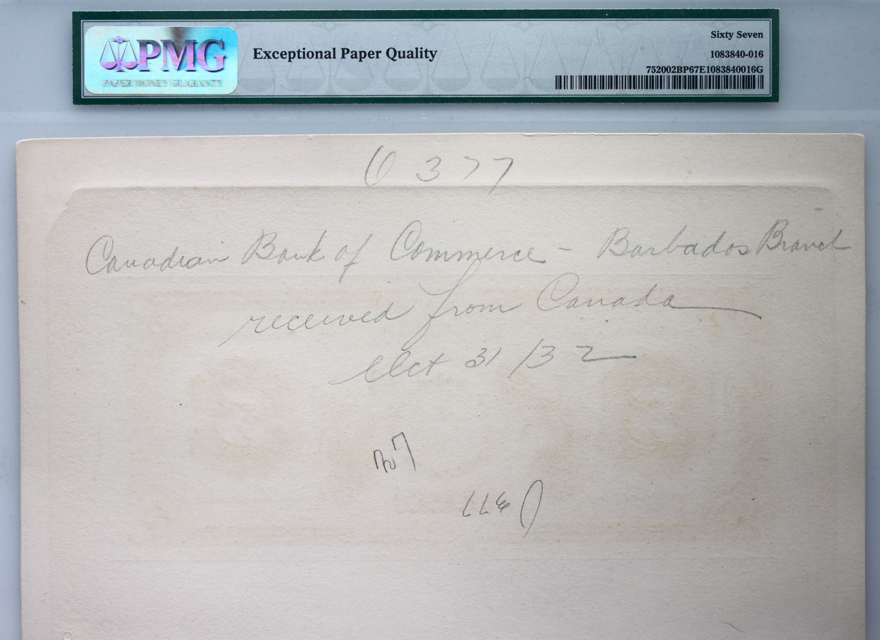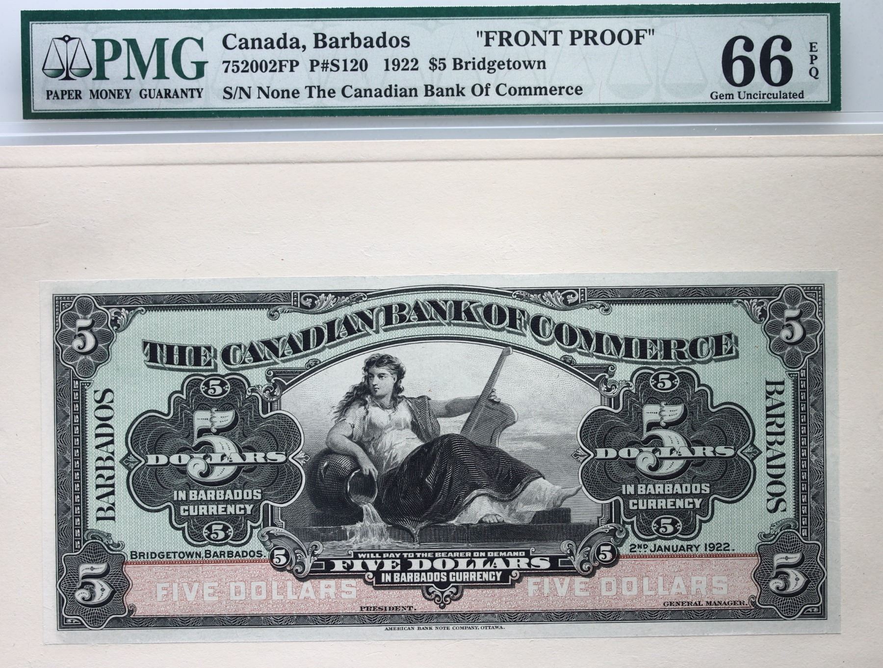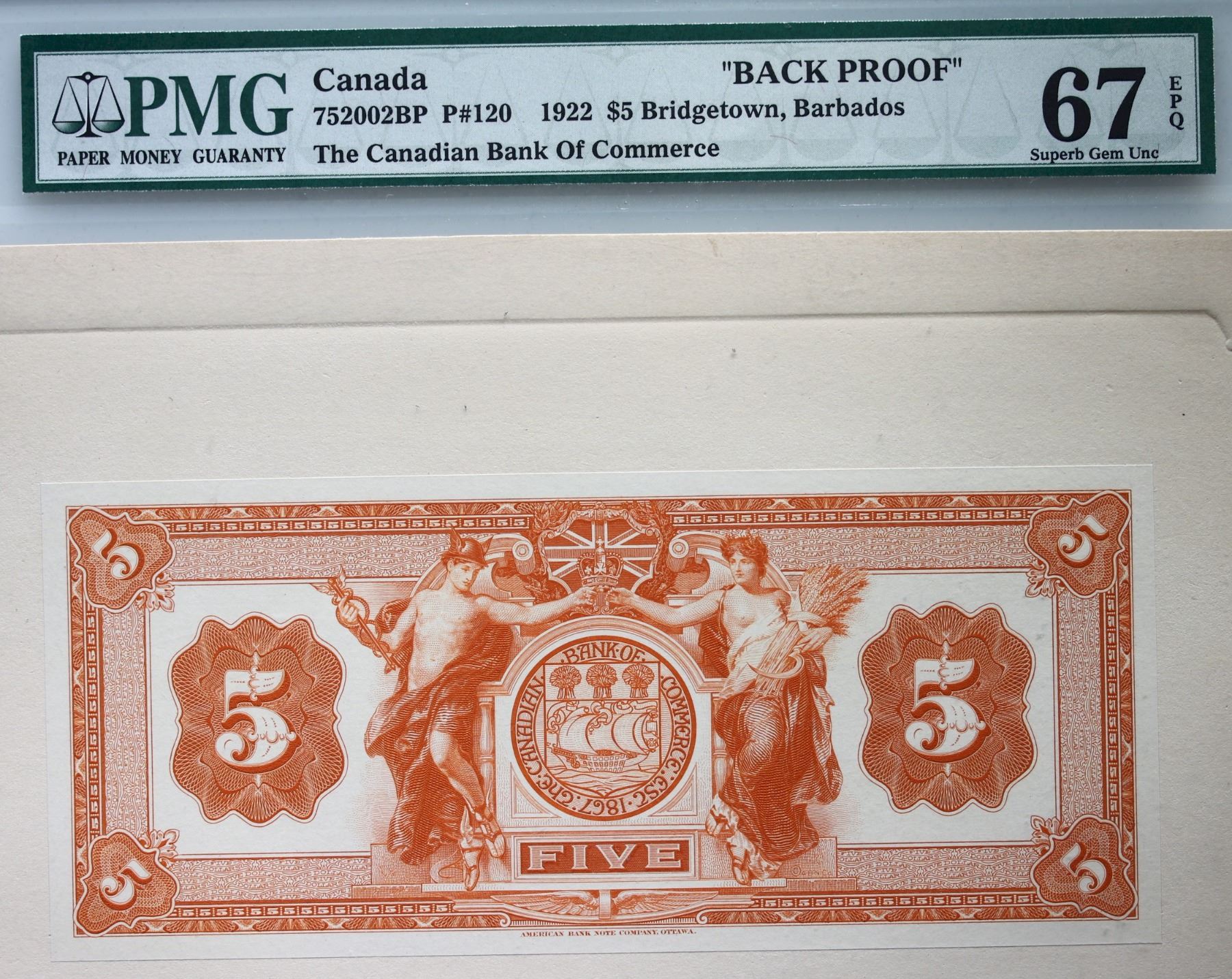 The Canadian Bank of Commerce; 1922 $5 CH-75-20-02FP & Back Proof coloured Barbados examples, PMG Superb Gem Uncirculated-66EPQ & Superb Superb Gem Uncirculated-67EPQ. Housed in large double holder.