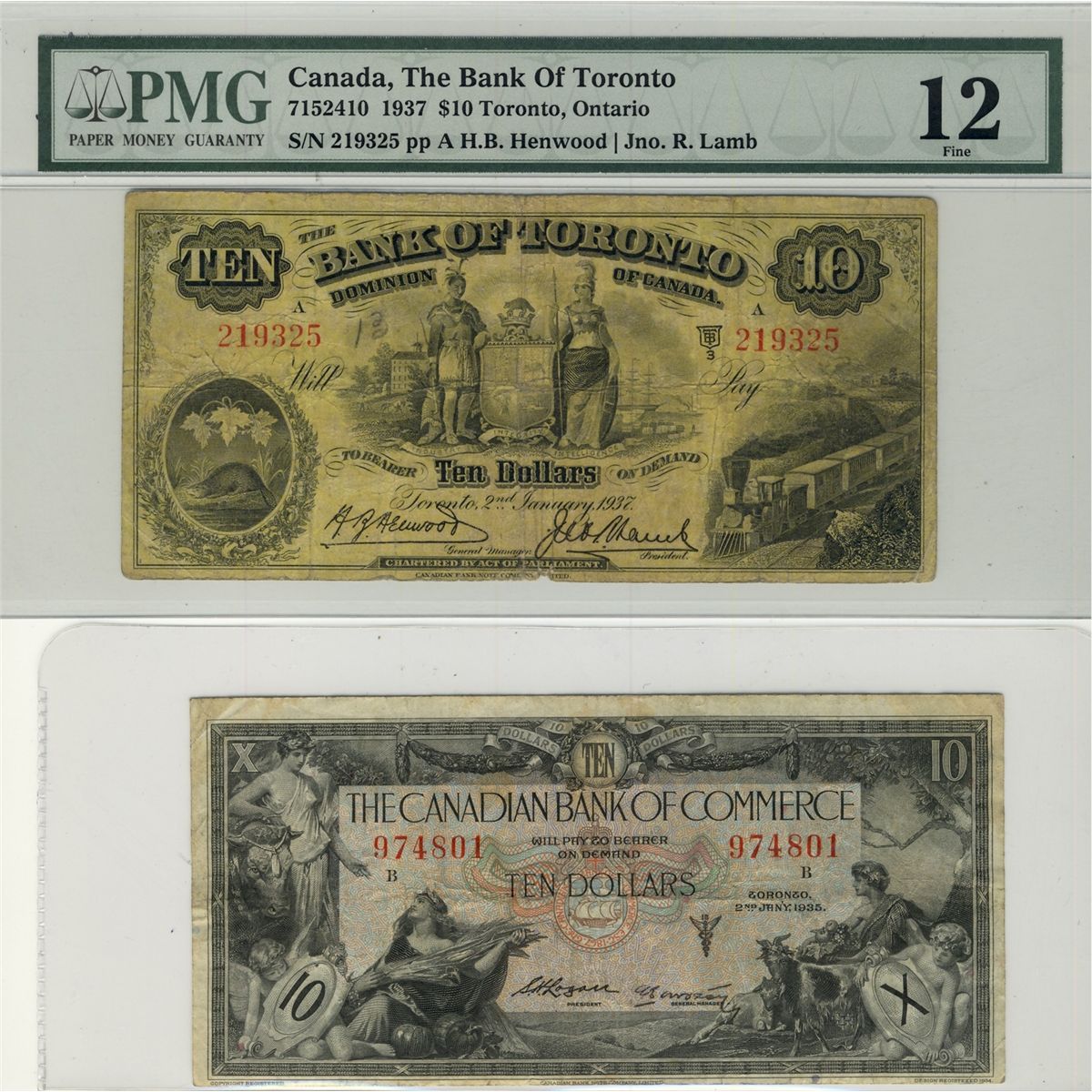 The Canadian Bank of Commerce; 1935 $10 #974801 & The Bank of Toronto 1937 $10 #219325. Lot of 2 notes both in Fine condition. Bank ot TO graded PMG.