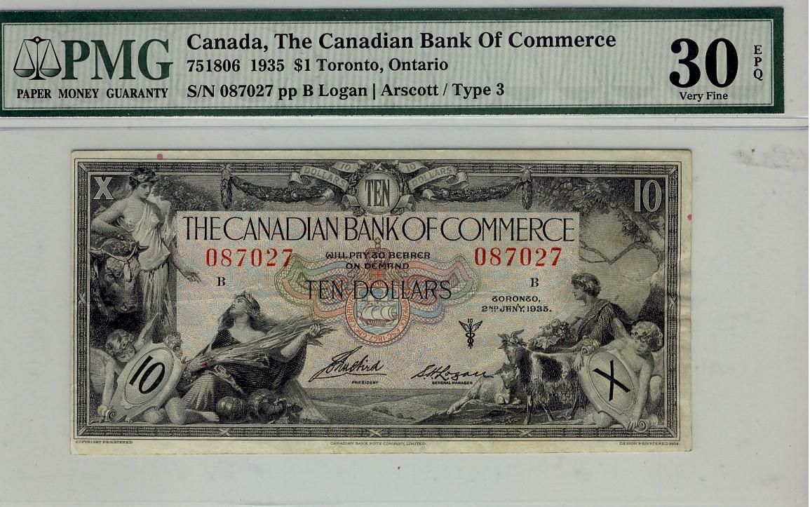 The Canadian Bank of Commerce 1935 $10 CH-75-18-06 #087027, PMG VF30 EPQ.