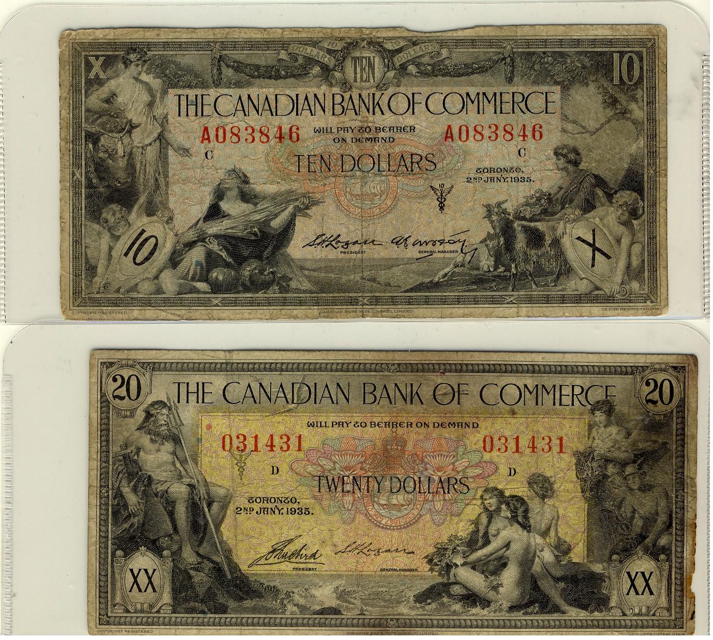 The Canadian Bank of Commerce 1935 $10 CH-75-18-06 & $20 CH-75-18-10. Lot of 2 notes Good to VG.