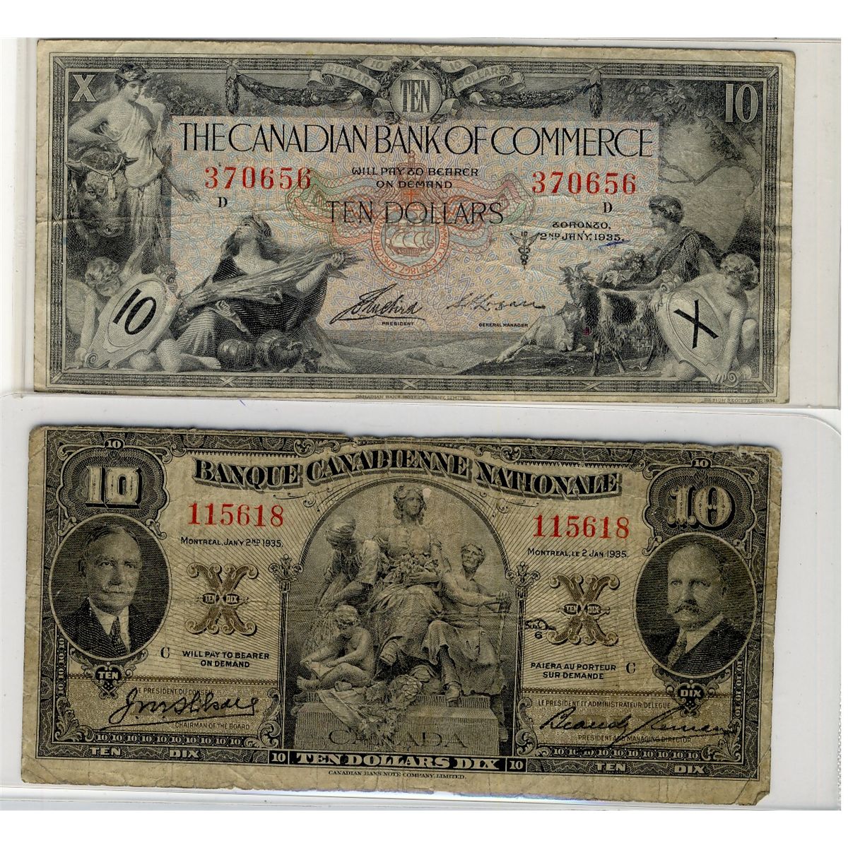 The Canadian Bank of Commerce 1935 $10 CH-75-18-06 & Banque Canadienne Nationale 1935 $10 CH-85-14-04. Lot of 2 notes VG to Fine.