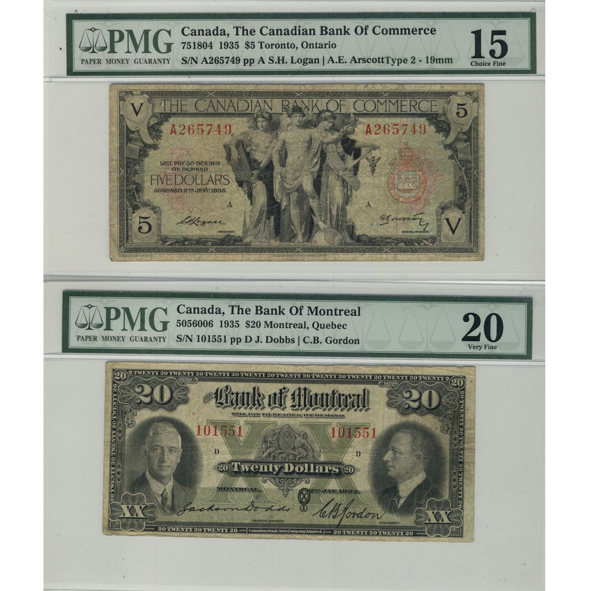 The Canadian Bank of Commerce; 1935 $5 #A265749 CH F15& The Bank of Montreal 1935 $20 VF20. Lot of 2 notes both PMG graded.