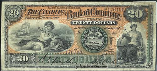 The Canadian Bank of Commerce, $20 1912 CH-75-14-42 No. 176100 Choice Fine/F+, a very nice and fairly well centered example. Lovely and attractive design!