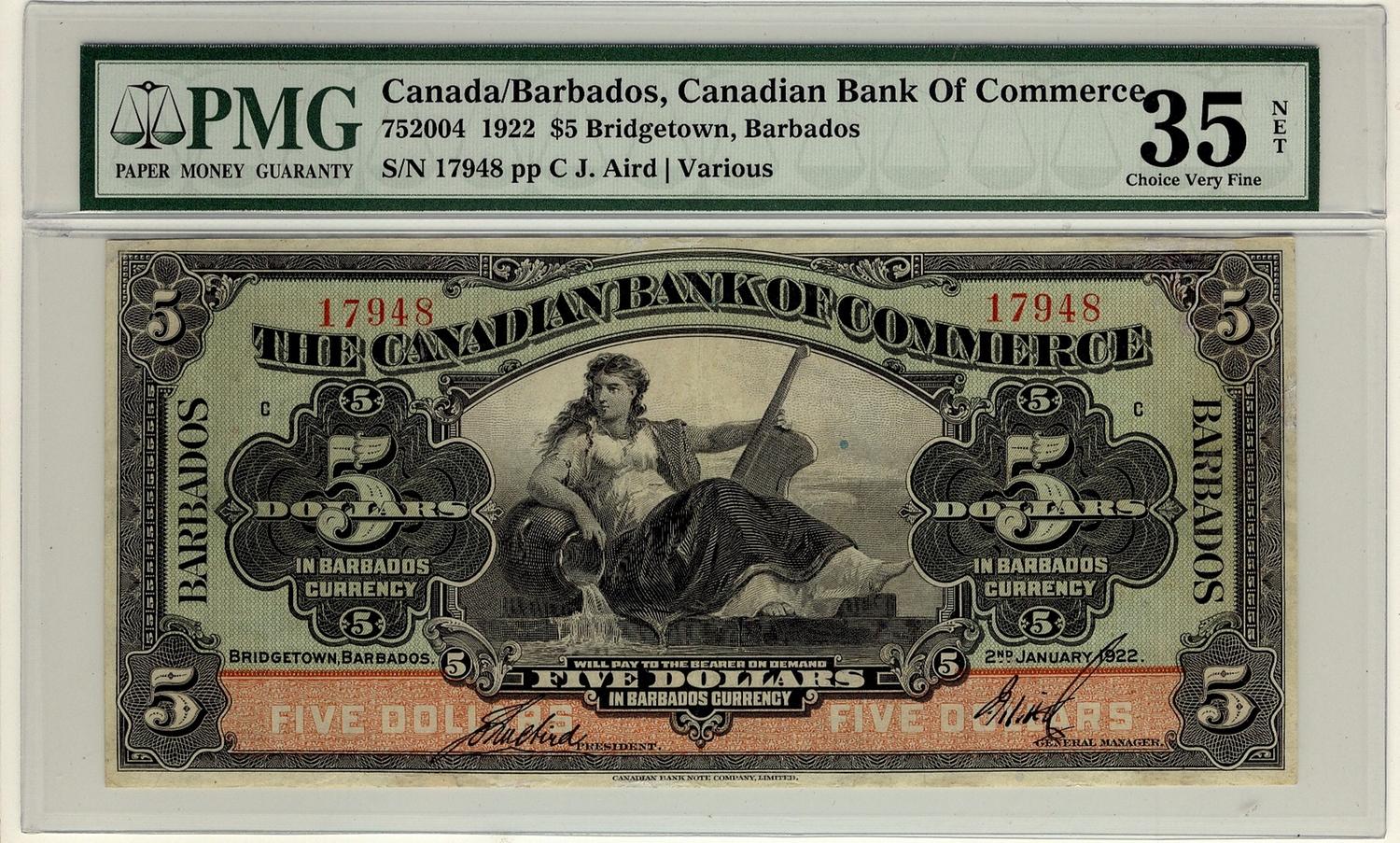 The Canadian Bank of Commerce, Barbados Issue, 1922 $5 #17948 CH-75-20-04, PMG VF35 Net, bright and very attractive. Professionally repaired. Very rare.