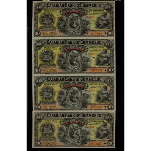 The Canadian Bank of Commerce Jan. 2sd, 1892. $10 CH-75-14-18S. An uncut sheet of four SPECIMEN notes. All notes are AU-UNC. Rare!