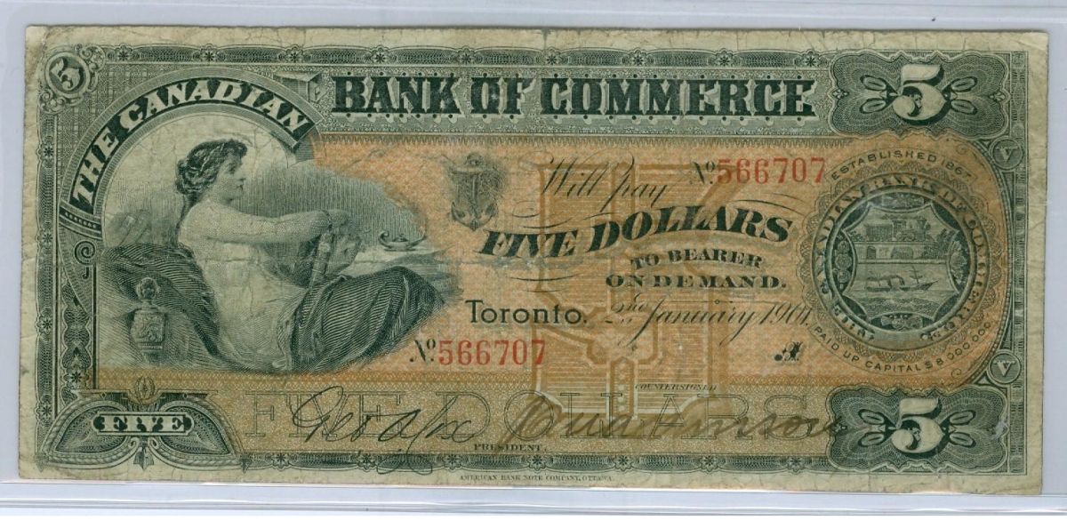 The Canadian Bank of commerce 1901 $5 #566707 CH-75-14-06, CCCS F15. A nice problem free example. Scarce date! Only 26 expamples known.