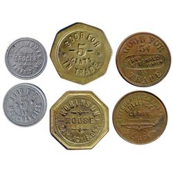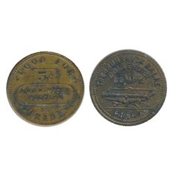 J.C. Lampman. Thorold, Ont. 5 Cents. 3.83 gms. Thick. Nickel; Breton-762. Robinson House. Camlachie, Ont. 5 Cents. Brass; Breton-764. Thos. McConnell,