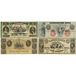 Lot of four (4) unissued obsolete US banknotes. $10 New Orleans Canal & Banking Co.; $5 Canal Bank of New Orleans; $5 Stonington Bank of Connect...