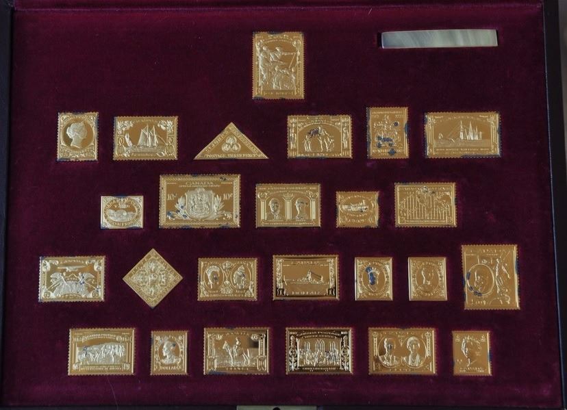 The Canadian Silver Stamp Collection - Large locking case (with key) containing description card, felt protective cloth cover and 25 Sterling Silver Plated in 24kt Gold Stamps ingots. Issued by the Franklin Mint, some are tarnished on the one side = 455+ gms. 13+ ozs. This set was issued in the 1970s (Silver price avg. $22.72 oz = approx. $295 melt for this set).