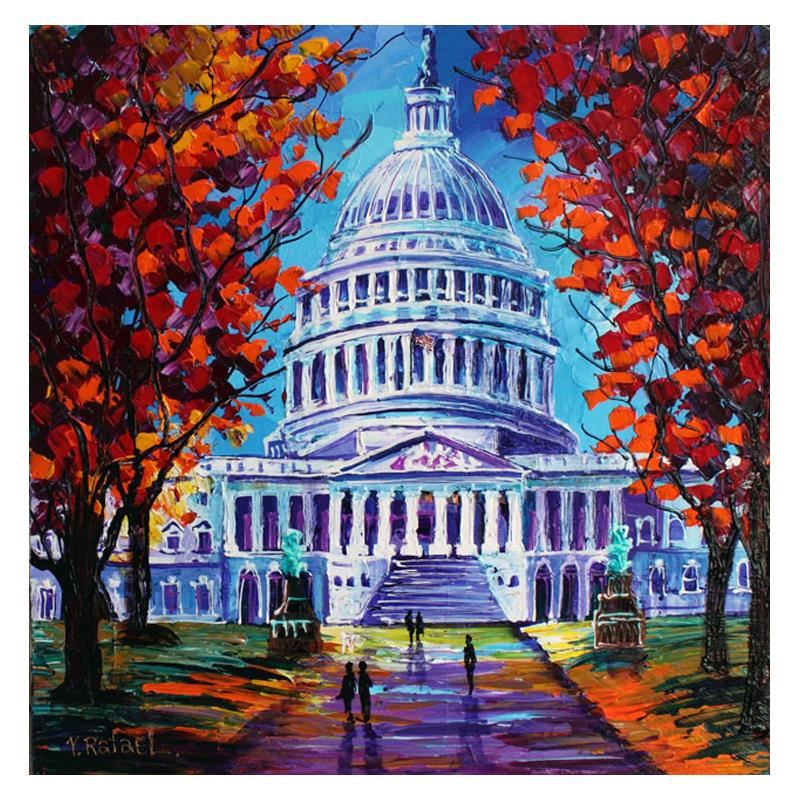 "The Capital" is an original painting, acrylic on stretched canvas, by Yana Rafael. Hand signed by the artist, this piece is accompanied by certificate of authenticity and measures approximately 24" x 24".