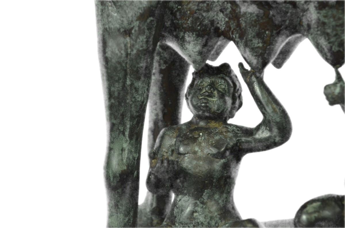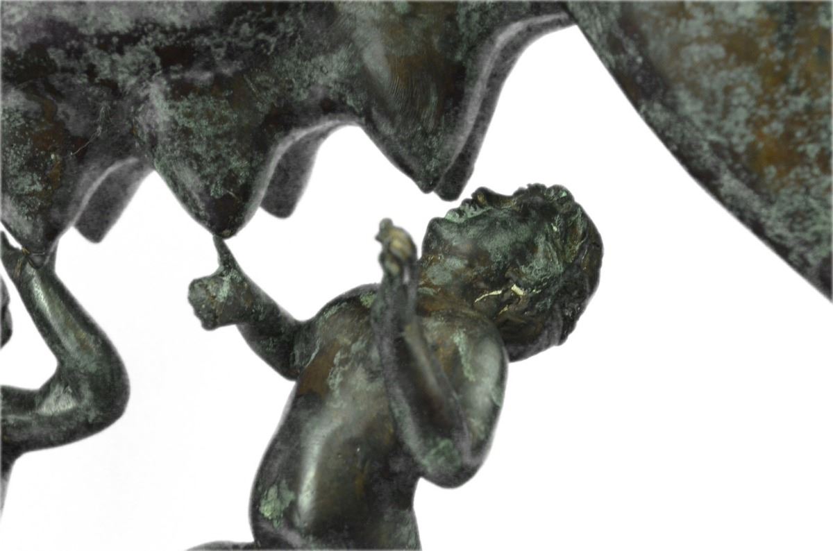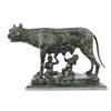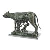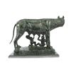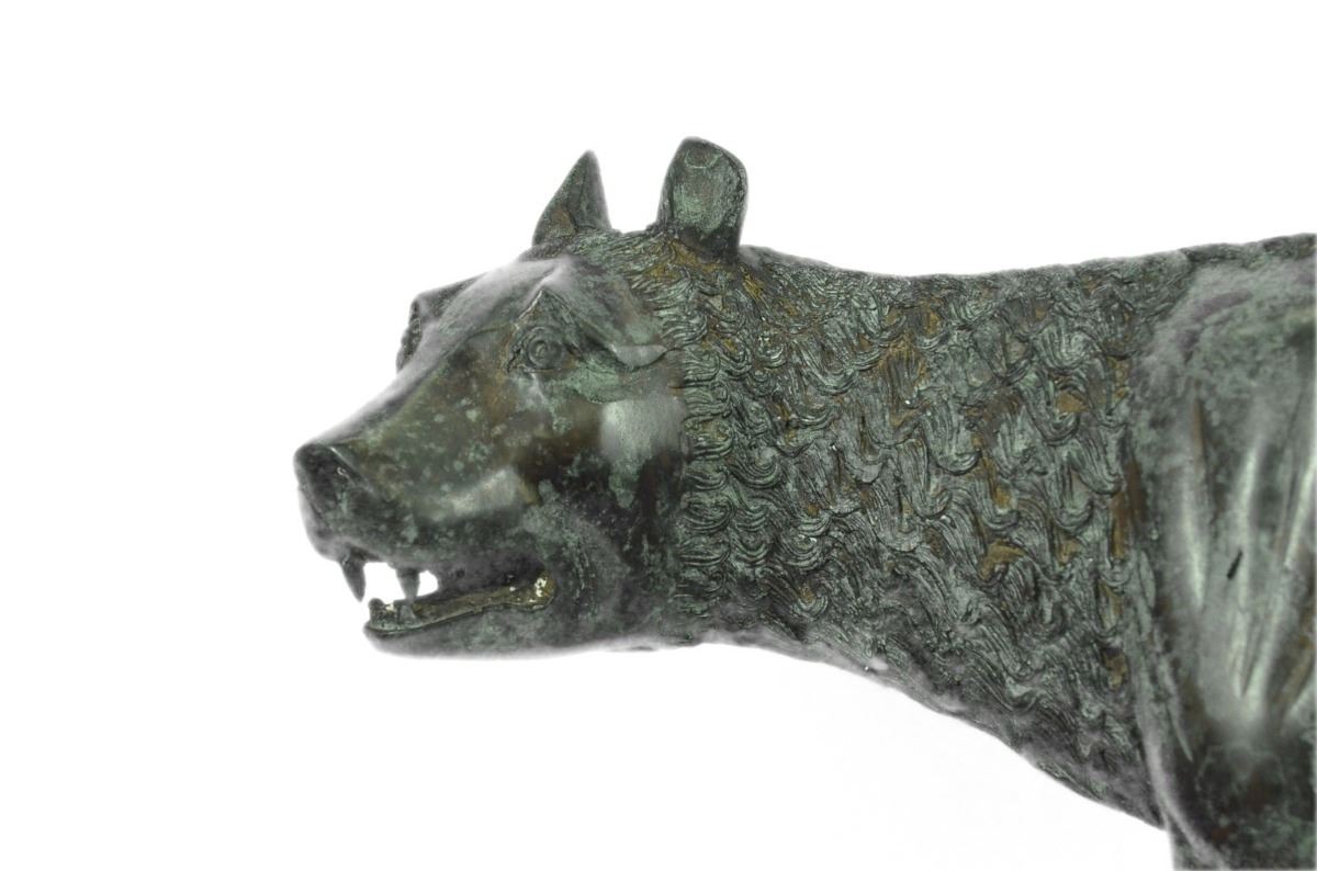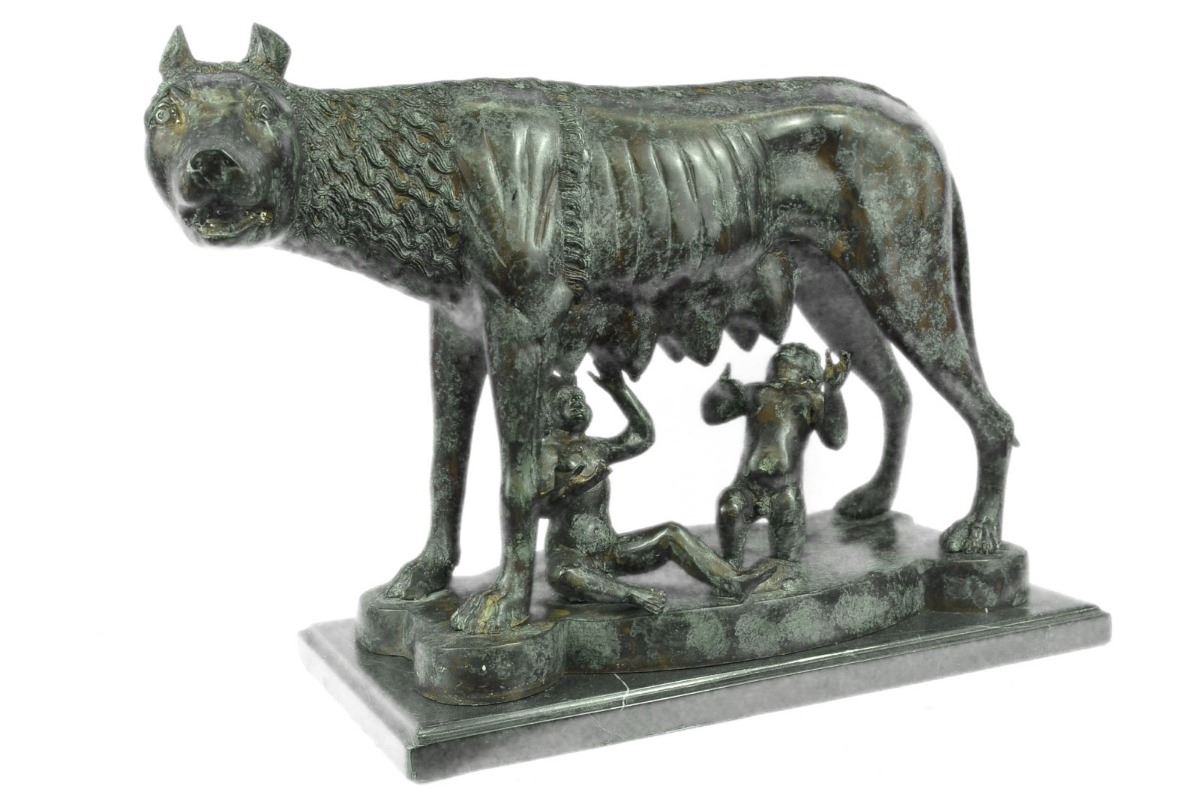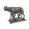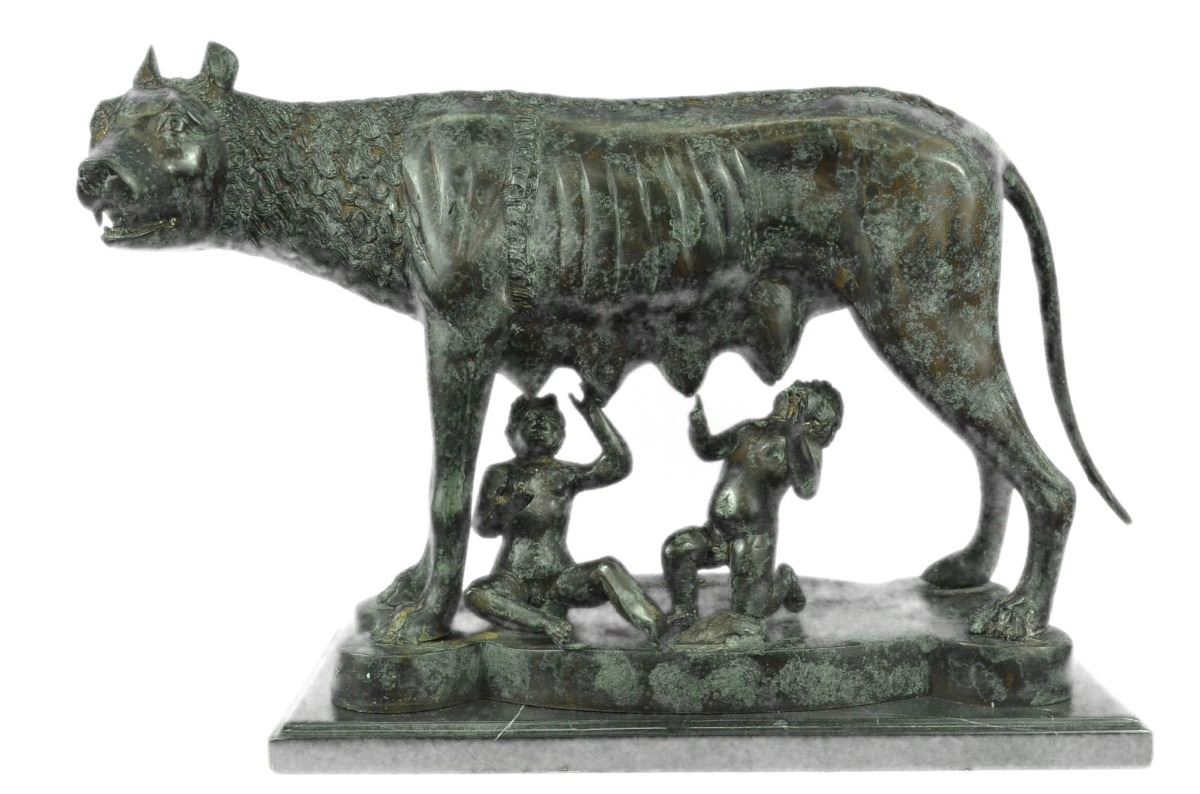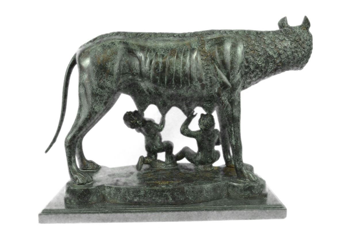 The Statue Itself Is A Two Toned Patina, Dark And With An Antique Rustic Green Accentuating The Detail And Mimicking An Aged Effect. It Is Of She-Wolf In A Standing Position Over The Twin Brothers, Romulus And Remus. She Stands Firm And Has Intricate Detailing Of A Thicker Mane Around Her Neck And Down Her Spine. Her Ribs Are Accentuated And Her Ears Are Upright. She Protects The Boys With Her Body And Shields Them From Harm. Underneath Are Romulus And Ramus. One Boy Sit'S With His Palms Up Under Her Breasts, His Mouth Just Under Her Nipple. The Other Kneels And Also Has His Palms Facing Upwards. They Both Seem To Rejoice In The Fact That They Are Being Given Nourishment. The Sculpture Rests On A Square Slab Of Bronze And Is Engraved In Gold With The Words Romulus And Remus. It Is Made Using The "Lost Wax Method" And Is A Two Tone Patina. Bronze Dimensions With Marble Base: Height 16 X Width 23 inches. Weight: 40 Lbs.