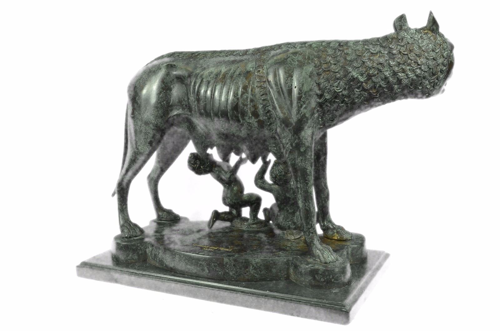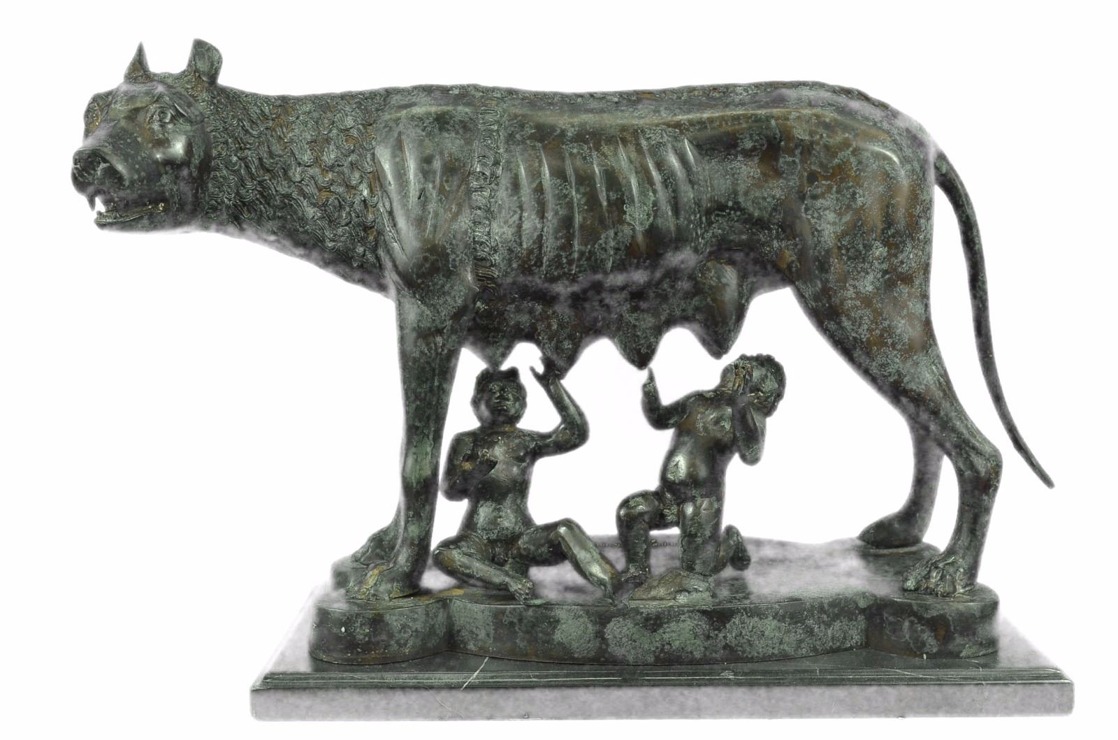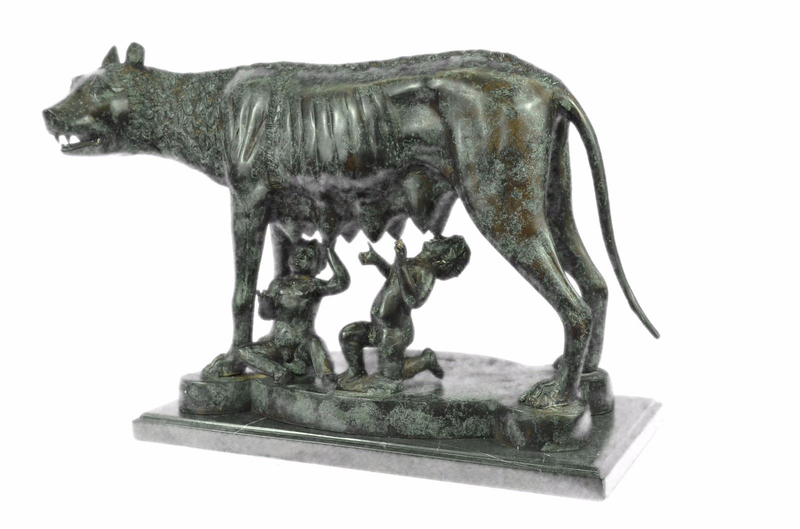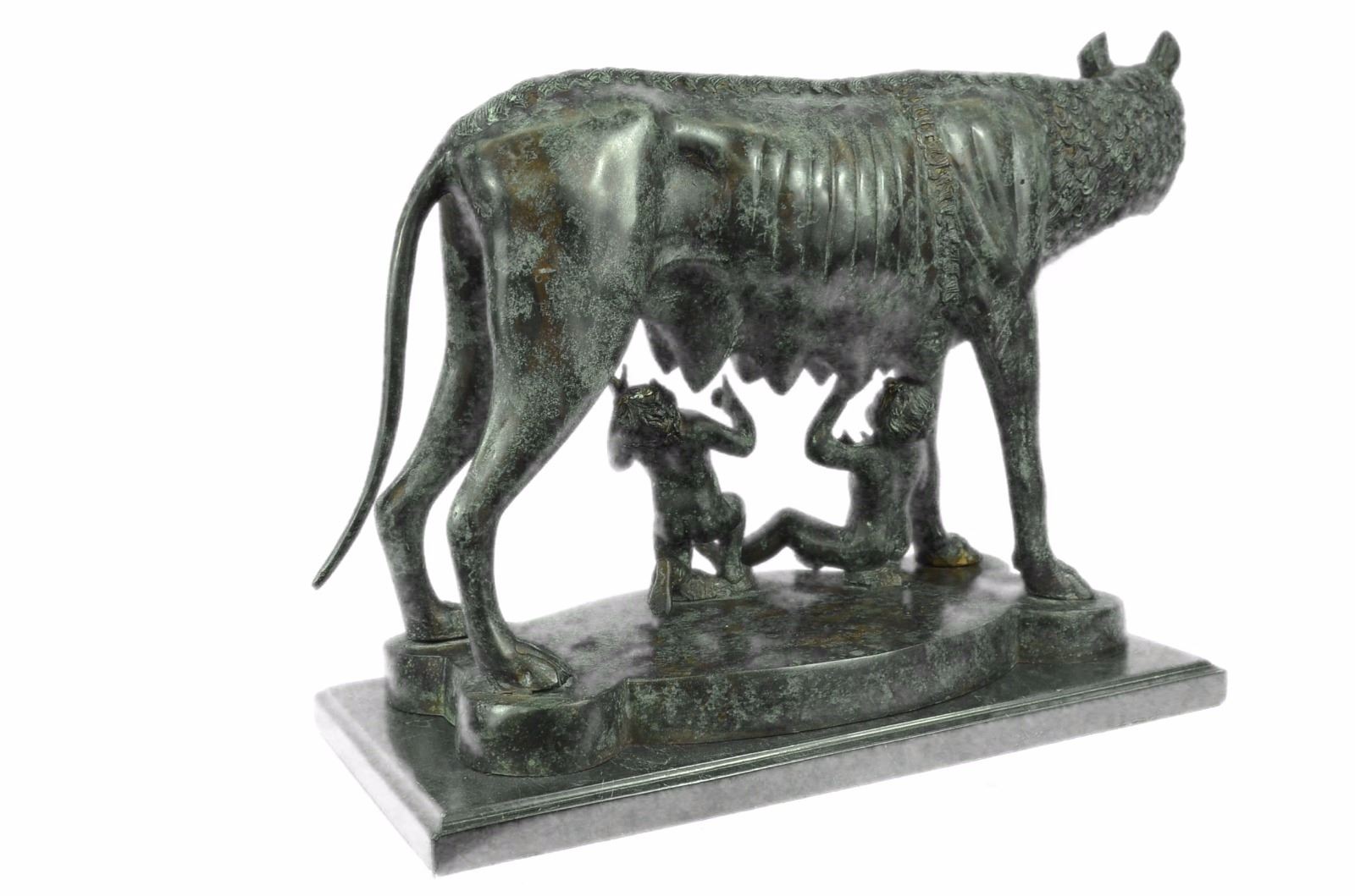 The Statue Itself Is A Two Toned Patina, Dark And With An Antique Rustic Green Accentuating The Detail And Mimicking An Aged Effect. It Is Of She-Wolf In A Standing Position Over The Twin Brothers, Romulus And Remus. She Stands Firm And Has Intricate Detailing Of A Thicker Mane Around Her Neck And Down Her Spine. Her Ribs Are Accentuated And Her Ears Are Upright. She Protects The Boys With Her Body And Shields Them From Harm. Underneath Are Romulus And Ramus. One Boy Sit'S With His Palms Up Under Her Breasts, His Mouth Just Under Her Nipple. The Other Kneels And Also Has His Palms Facing Upwards. They Both Seem To Rejoice In The Fact That They Are Being Given Nourishment. The Sculpture Rests On A Square Slab Of Bronze And Is Engraved In Gold With The Words Romulus And Remus. It Is Made Using The "Lost Wax Method" And Is A Two Tone Patina. Bronze Dimensions With Marble Base: Height 16 X Width 23 inches. Weight: 40 Lbs.